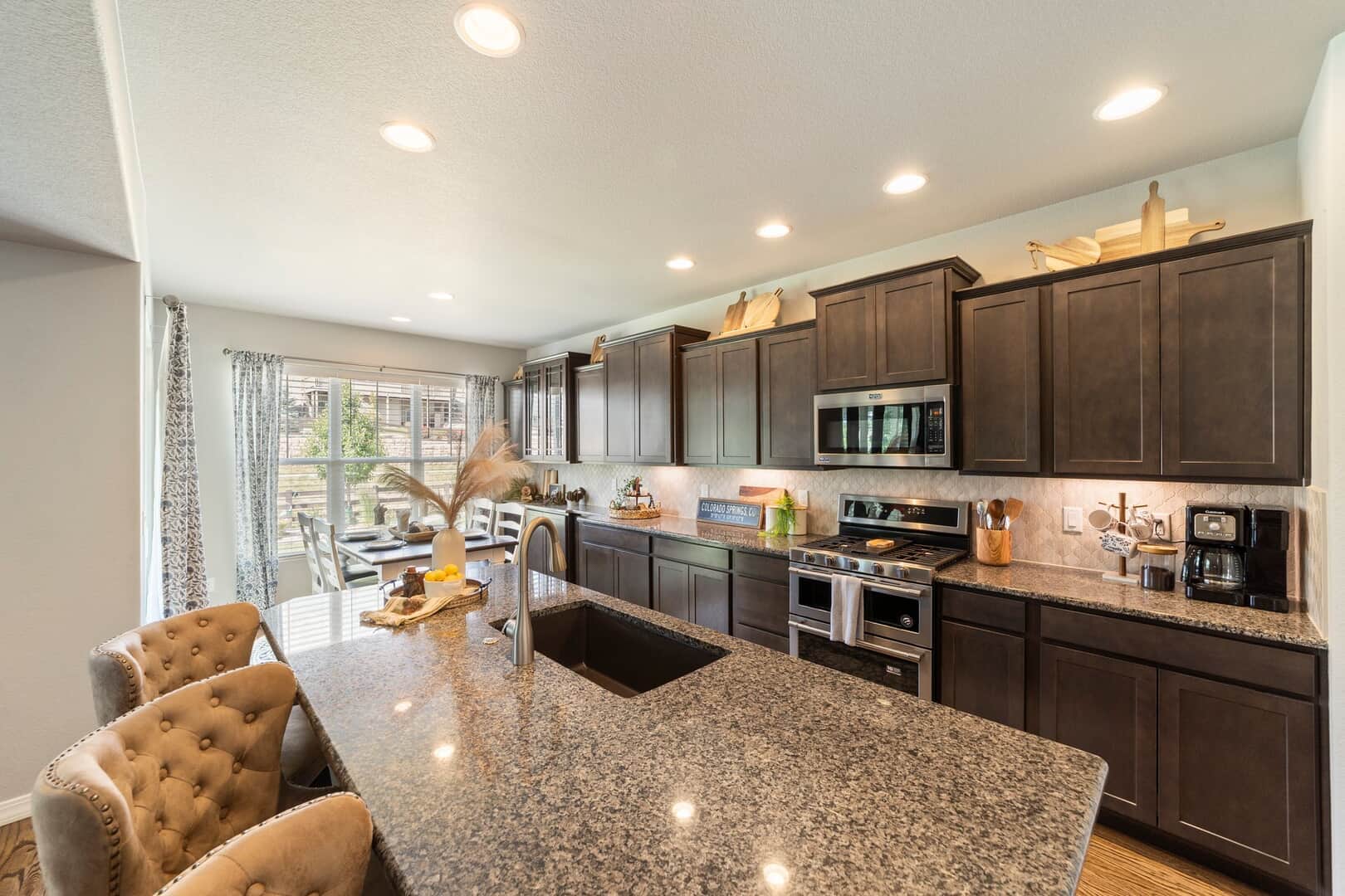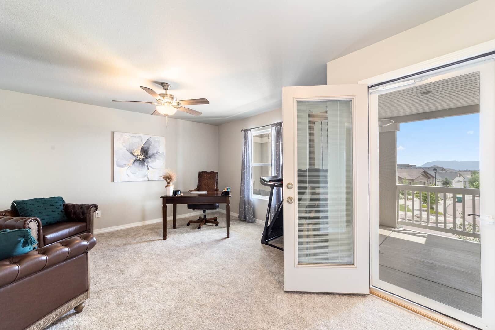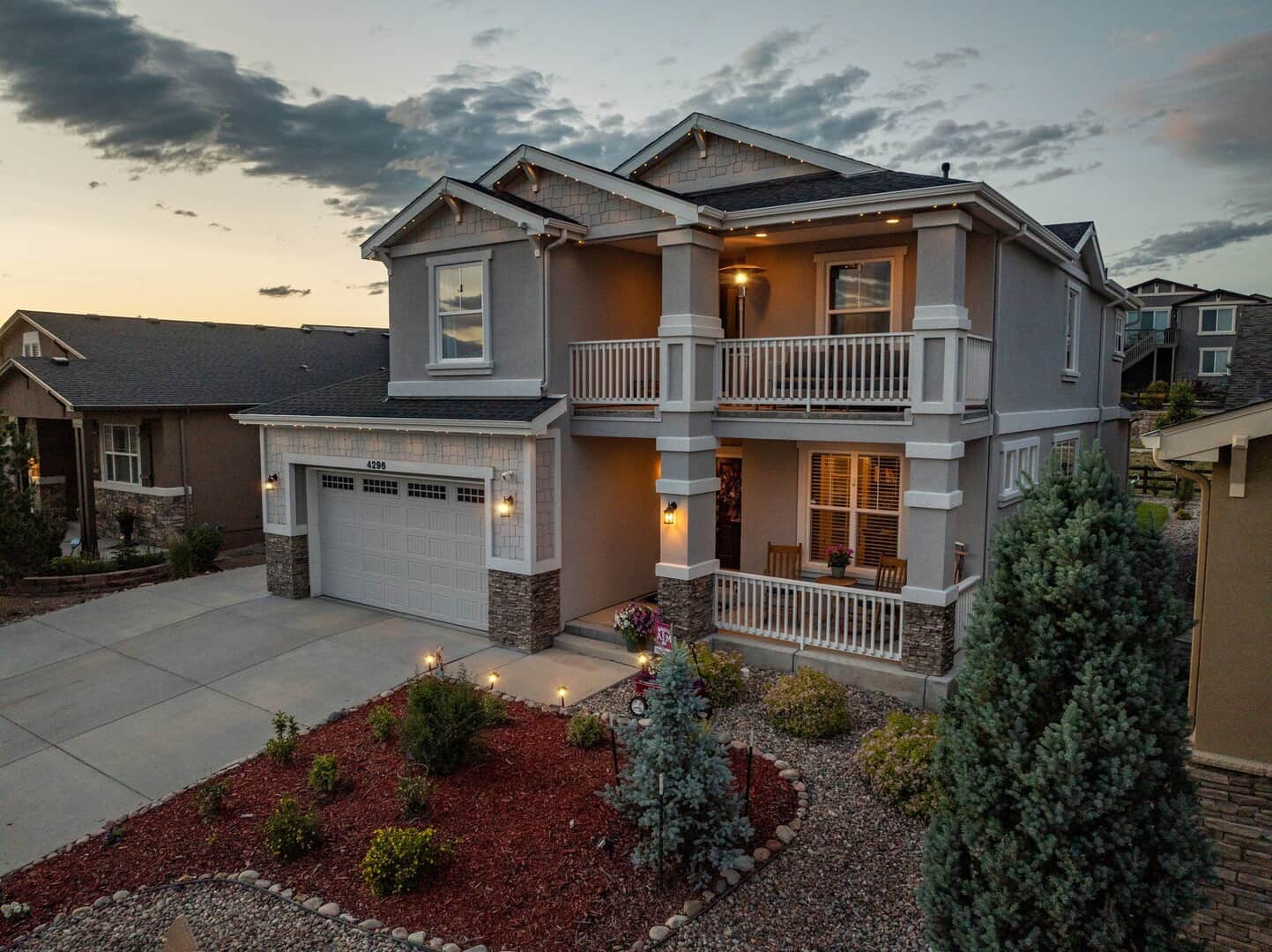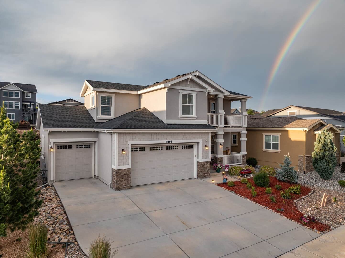 From the moment you arrive, this stunning Cordera home captures what we all love about life on the Front Range: space, light, and jaw-dropping views of Pikes Peak that greet you from every west-facing window. Step inside and discover a beautifully designed living space and elegant touches throughout. At the front of the home, a dedicated main-level office provides a dream work-from-home setup—with picturesque mountain views right from your desk. It’s hard to imagine a more inspiring space. The kitchen is sure to impress with rich, extended cabinetry, sleek granite countertops, & stainless steel appliances with a dual oven gas range. The adjacent formal dining room sets the stage for holidays and celebrations while the eat in dining space flows seamlessly to the great room to create conversation & connection around the stately fireplace with wooden mantel. Upstairs, The primary suite is a sanctuary, featuring a soaker tub, walk-in shower, 2 separate vanities, & walk-in closet. Brand new carpet adds comfort to the entire upper level. Down the hall experience 2 additional bedrooms each with stunning views, a large laundry room & a full guest bath. The spacious loft leads to a private balcony that might just become your favorite place in the house. Uninterrupted 180-degree views of the Front Range and Pikes Peak stretch out before you—perfect for morning coffee, evening sunsets, or simply a breath of fresh mountain air. Downstairs, a massive rec room offers all the space for games, movies, & expansion—already pre-plumbed for a wet bar. Well equipped with ample storage & complete with an additional bedroom & guest bath. Outside, a covered patio backs to a scenic walking trail & offers beautiful landscaping. Bring all your toys and oversized trucks! The rare 4-car garage gives you all the space you need! Whether you’re working, hosting, relaxing, or just gazing westward—this home delivers the Colorado lifestyle in every direction.