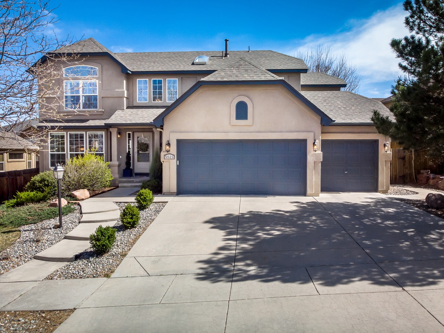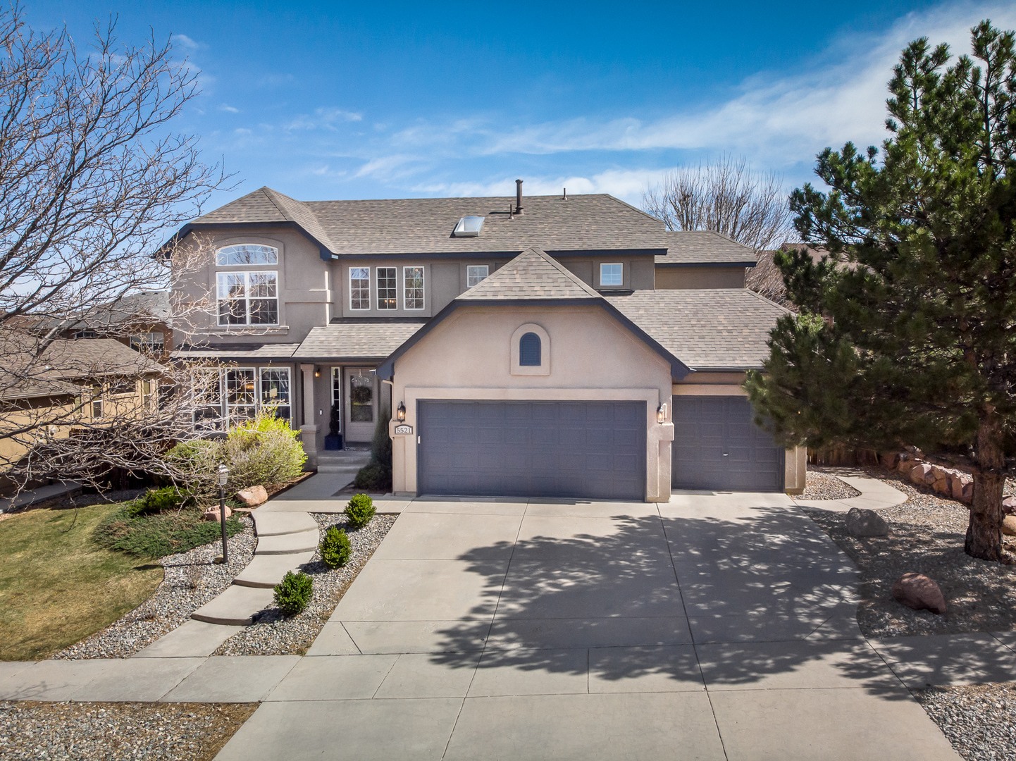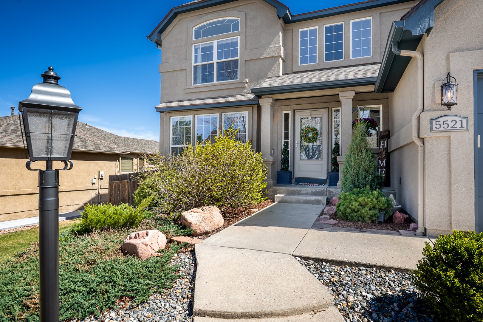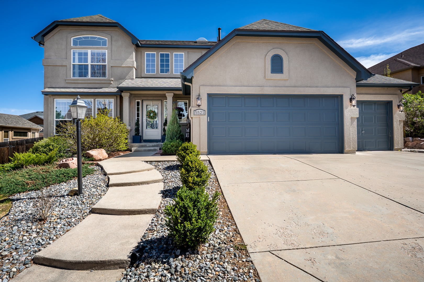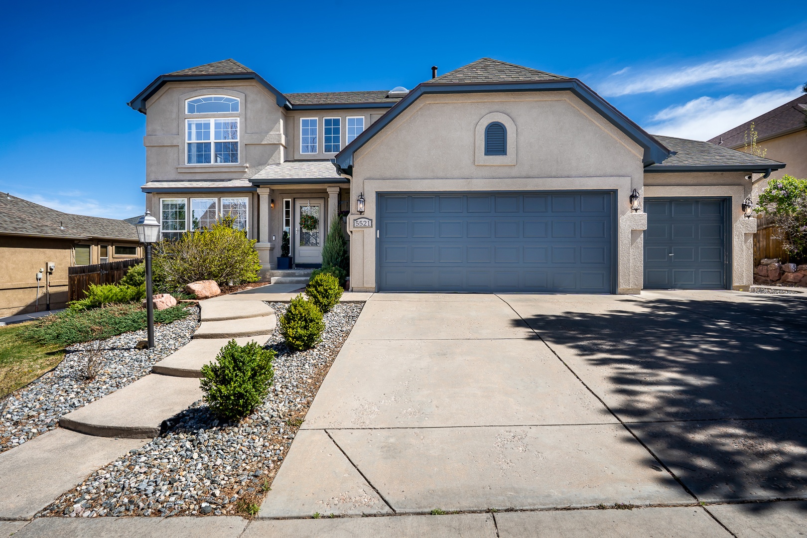 Step into this well-maintained south-facing stucco home in Indigo Ranch at Ridgeview, where mountain views welcome you from the front porch. A thoughtfully updated, spacious two-story offers a functional layout with inviting, well-connected living spaces throughout. The main level features hardwood floors, high ceilings, and updated finishes that create a clean, cohesive feel. The kitchen includes maple cabinetry, quartzite countertops, stainless steel appliances, and a pantry that flows seamlessly into the spacious great room, creating a layout that feels expansive and very functional. A wall of windows and 20-foot ceilings bring in abundant natural light, enhancing the sense of space, while built-ins and a gas fireplace with a custom mantle add comfortable everyday living. Convenient main-level powder room and laundry room. Upstairs, the vaulted primary suite includes hardwood flooring, a five-piece bath with soaking tub, dual vanities, and a walk-in closet. Two additional bedrooms and a loft-style balcony overlook into the great room, serving as a unique architectural feature and focal point. The finished basement offers 9-foot ceilings, a large recreation area, and a fourth bedroom with a walk-in closet and full bath, making it an ideal guest suite or private living space. The rear yard is private and fully fenced with mature landscaping and a large concrete patio, perfect for relaxing, enjoying summer BBQs, and hosting gatherings. Additional features include an oversized 3-car garage, central air, plantation shutters, updated lighting, a new roof installed in 2024, a radon mitigation system, some fresh interior paint, exterior repainted, and a newer kitchen floor. Located near parks, trails, schools, and shopping along the Powers Corridor with convenient access to Peterson and Schriever Space Force Bases. This home checks all the boxes with space, updates, and location—schedule your showing and see why this one stands out the moment you walk in! .