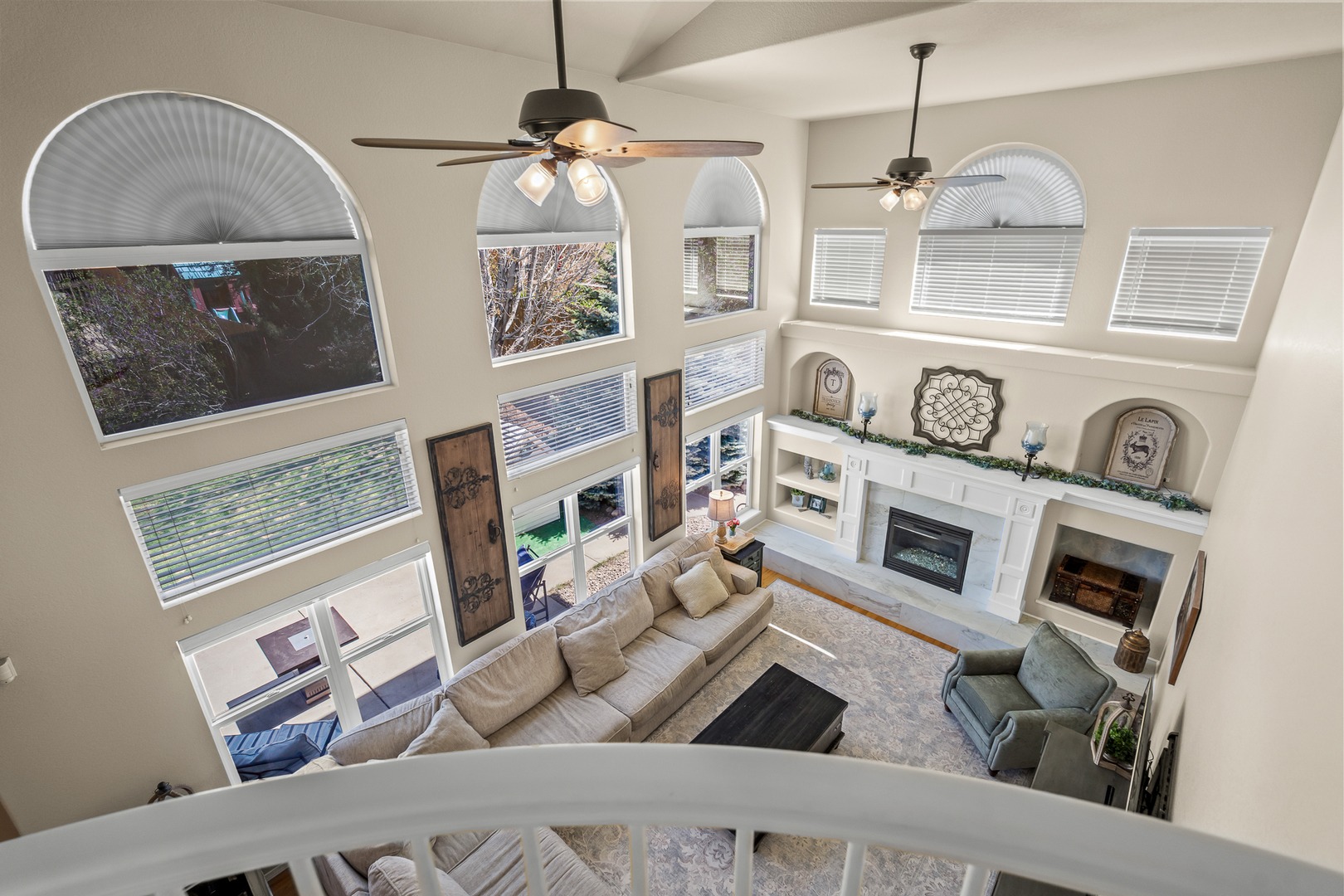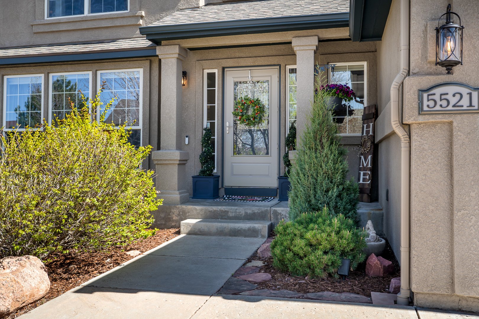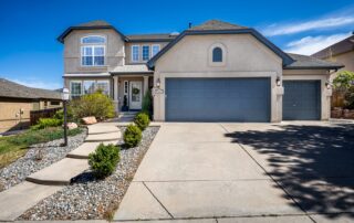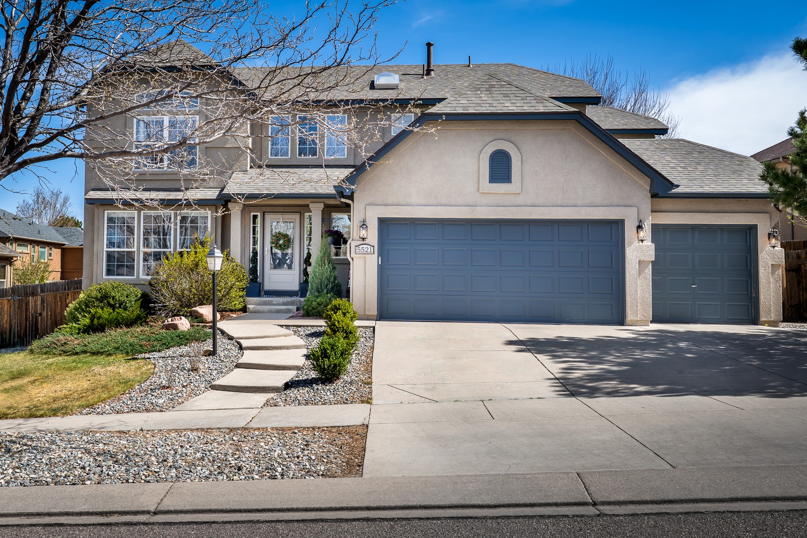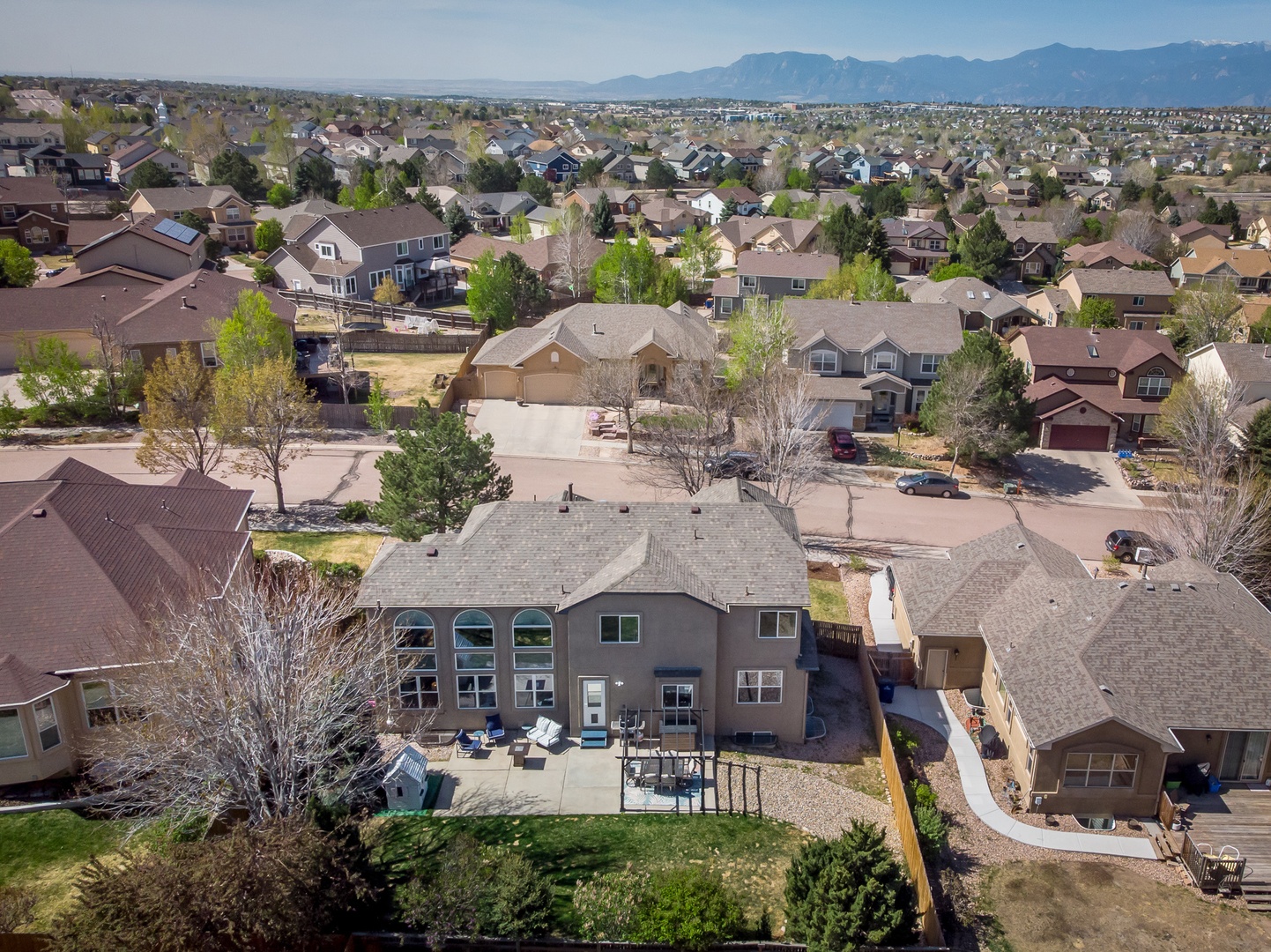 Step into this well-maintained south-facing stucco home in Indigo Ranch at Ridgeview, where mountain views welcome you from the front porch. A thoughtfully updated, spacious two-story offers a functional layout with inviting, well-connected living spaces throughout. The main level features hardwood floors, high ceilings, and updated finishes that create a clean, cohesive feel. The kitchen includes maple cabinetry, quartzite countertops, stainless steel appliances, and a pantry that flows seamlessly into the spacious great room, creating a layout that feels expansive and very functional. A wall of windows and 20-foot ceilings bring in abundant natural light, enhancing the sense of space, while built-ins and a gas fireplace with a custom mantle add comfortable everyday living. Convenient main-level powder room and laundry room. Upstairs, the vaulted primary suite includes hardwood flooring, a five-piece bath with soaking tub, dual vanities, and a walk-in closet. Two additional bedrooms and a loft-style balcony overlook into the great room, serving as a unique architectural feature and focal point. The finished basement offers 9-foot ceilings, a large recreation area, and a fourth bedroom with a walk-in closet and full bath, making it an ideal guest suite or private living space. The rear yard is private and fully fenced with mature landscaping and a large concrete patio, perfect for relaxing, enjoying summer BBQs, and hosting gatherings. Additional features include an oversized 3-car garage, central air, plantation shutters, updated lighting, a new roof installed in 2024, a radon mitigation system, some fresh interior paint, exterior repainted, and a newer kitchen floor. Located near parks, trails, schools, and shopping along the Powers Corridor with convenient access to Peterson and Schriever Space Force Bases. This home checks all the boxes with space, updates, and location—schedule your showing and see why this one stands out the moment you walk in! .