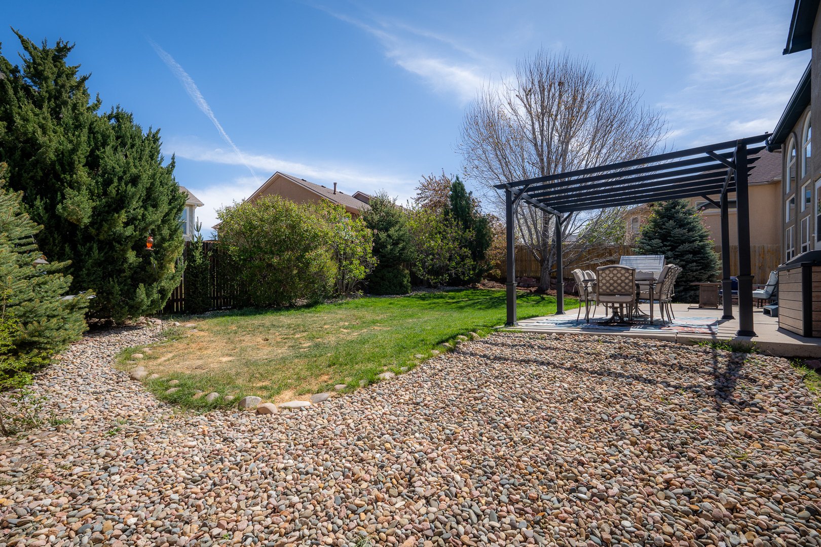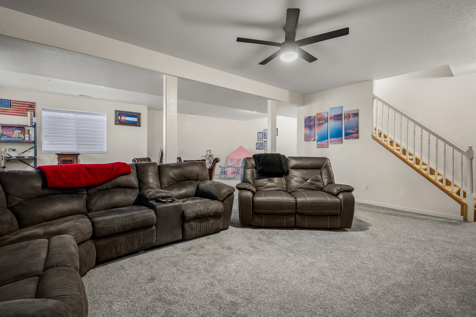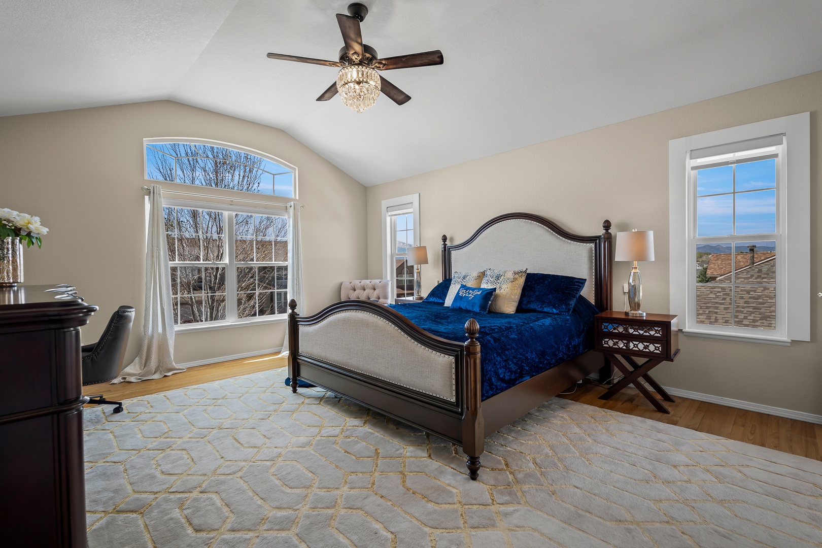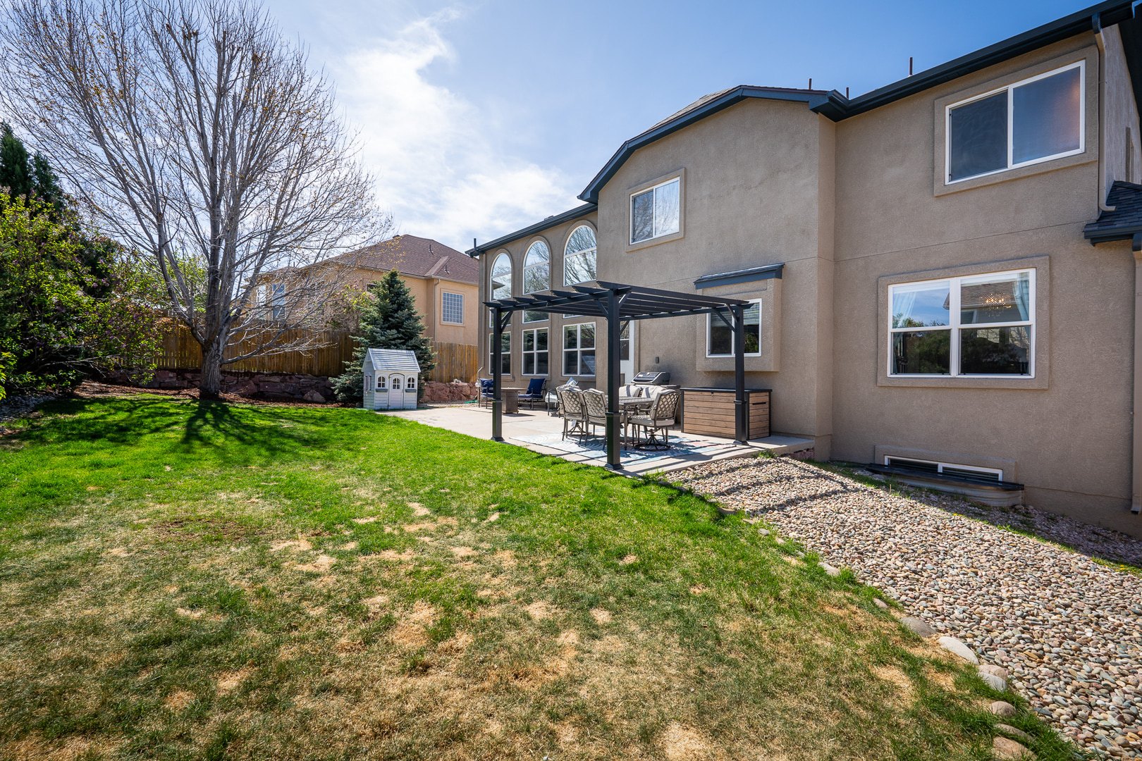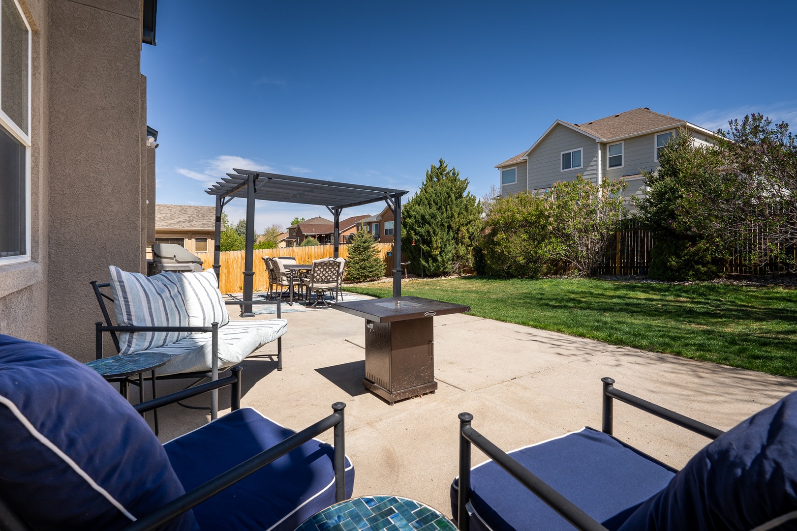 Step into this well-maintained south-facing stucco home in Indigo Ranch at Ridgeview, where mountain views welcome you from the front porch. A thoughtfully updated, spacious two-story offers a functional layout with inviting, well-connected living spaces throughout. The main level features hardwood floors, high ceilings, and updated finishes that create a clean, cohesive feel. The kitchen includes maple cabinetry, quartzite countertops, stainless steel appliances, and a pantry that flows seamlessly into the spacious great room, creating a layout that feels expansive and very functional. A wall of windows and 20-foot ceilings bring in abundant natural light, enhancing the sense of space, while built-ins and a gas fireplace with a custom mantle add comfortable everyday living. Convenient main-level powder room and laundry room. Upstairs, the vaulted primary suite includes hardwood flooring, a five-piece bath with soaking tub, dual vanities, and a walk-in closet. Two additional bedrooms and a loft-style balcony overlook into the great room, serving as a unique architectural feature and focal point. The finished basement offers 9-foot ceilings, a large recreation area, and a fourth bedroom with a walk-in closet and full bath, making it an ideal guest suite or private living space. The rear yard is private and fully fenced with mature landscaping and a large concrete patio, perfect for relaxing, enjoying summer BBQs, and hosting gatherings. Additional features include an oversized 3-car garage, central air, plantation shutters, updated lighting, a new roof installed in 2024, a radon mitigation system, some fresh interior paint, exterior repainted, and a newer kitchen floor. Located near parks, trails, schools, and shopping along the Powers Corridor with convenient access to Peterson and Schriever Space Force Bases. This home checks all the boxes with space, updates, and location—schedule your showing and see why this one stands out the moment you walk in! .