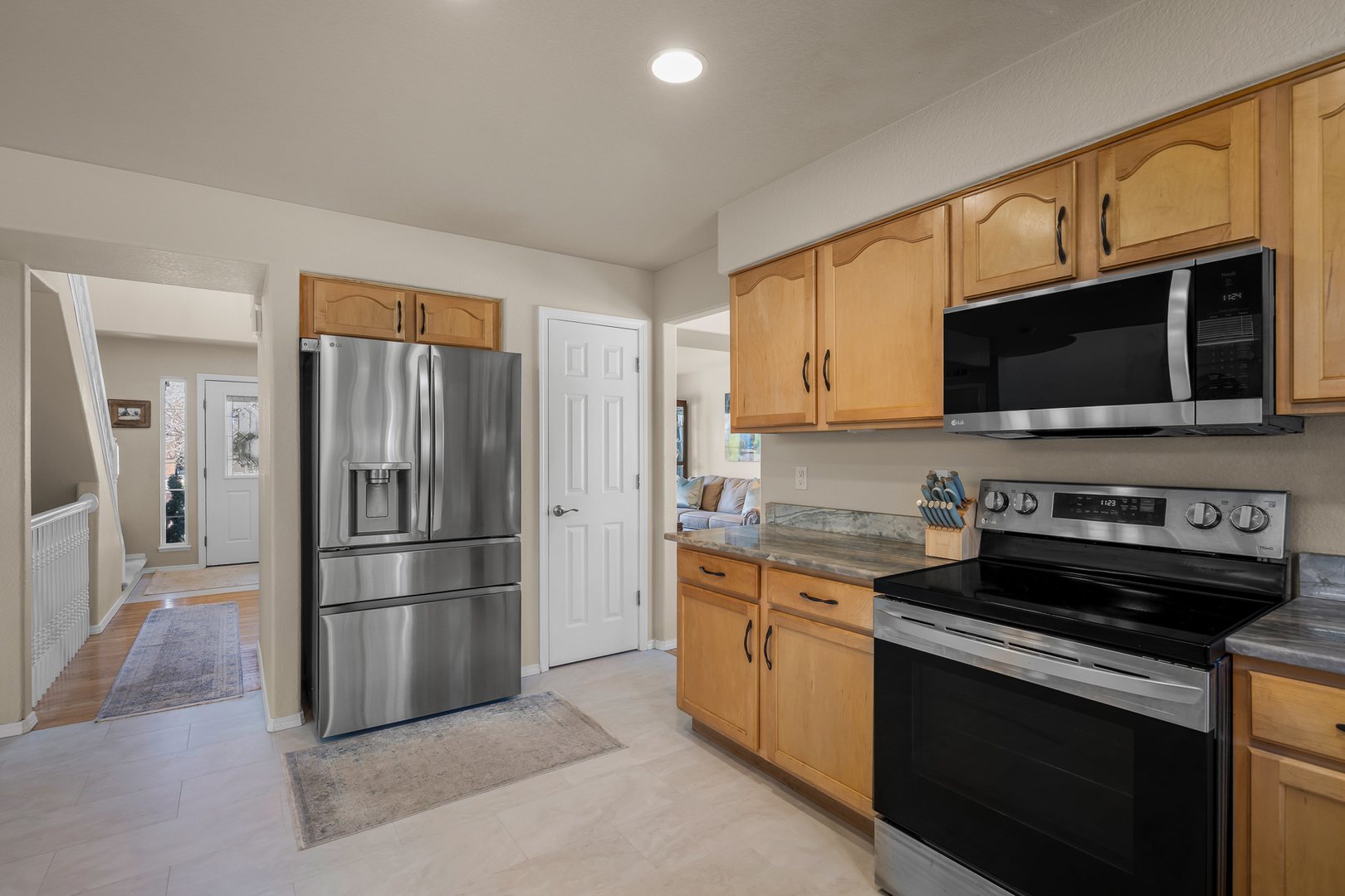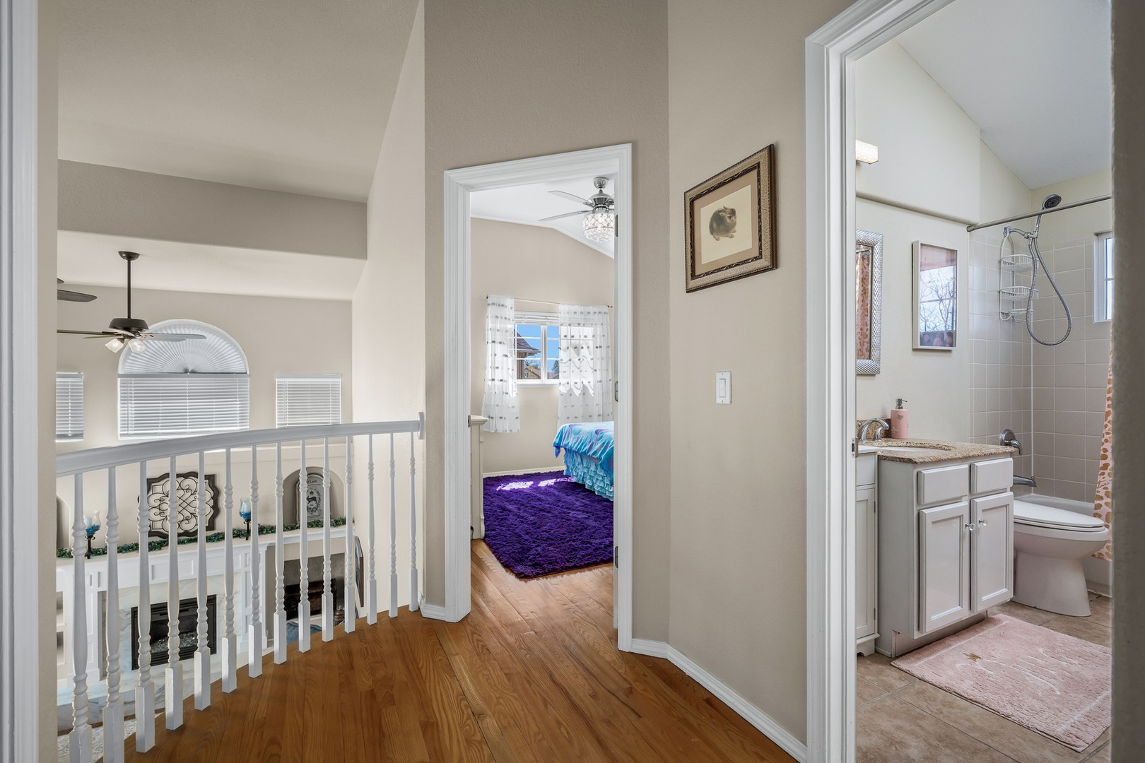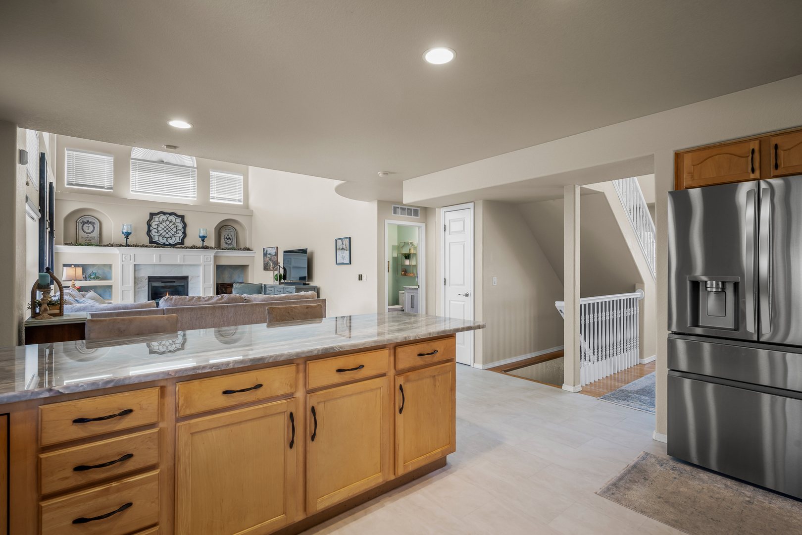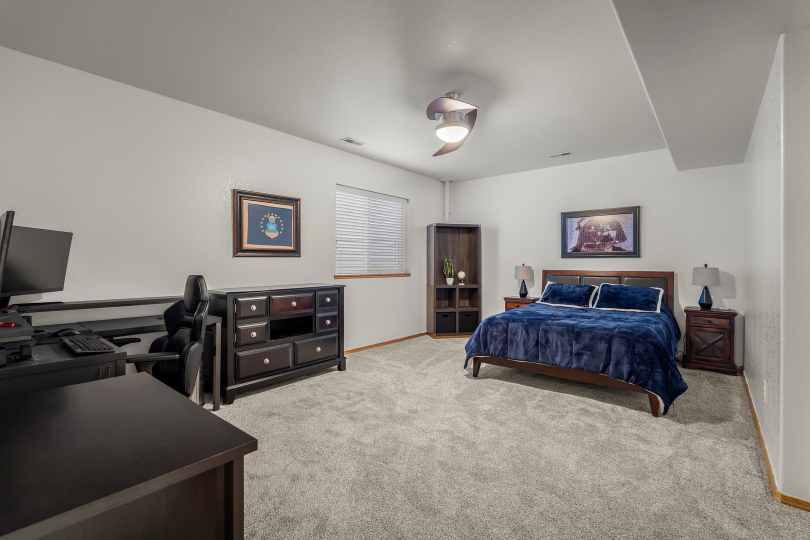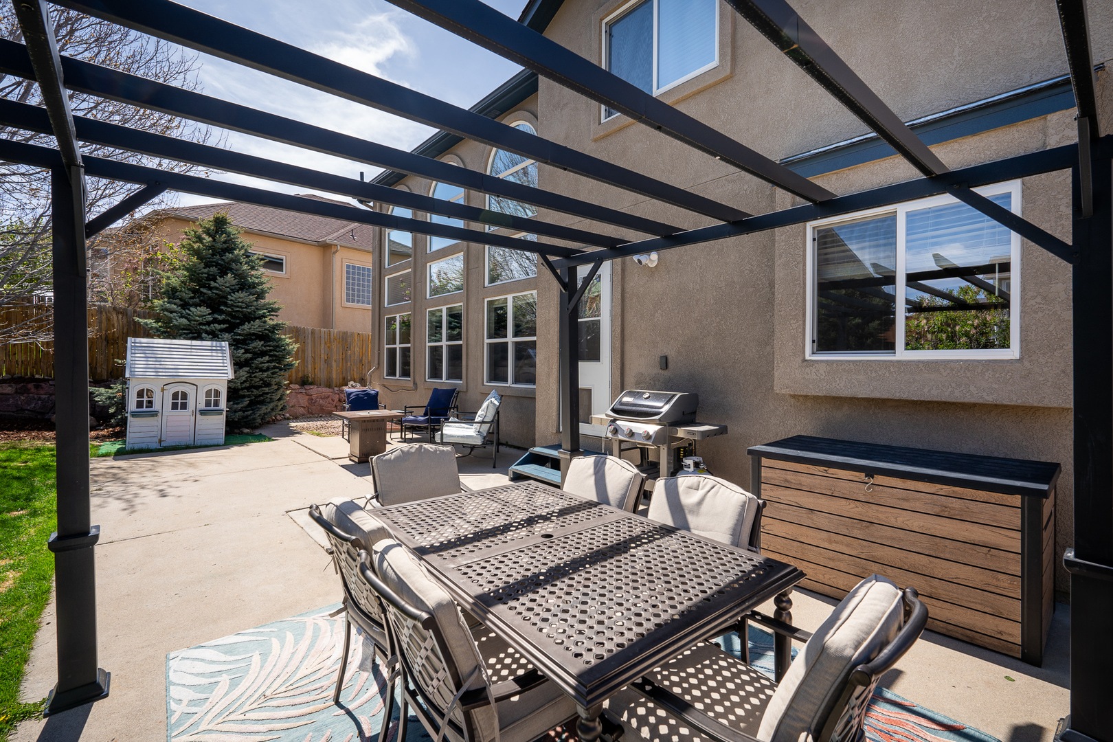 Step into this well-maintained south-facing stucco home in Indigo Ranch at Ridgeview, where mountain views welcome you from the front porch. A thoughtfully updated, spacious two-story offers a functional layout with inviting, well-connected living spaces throughout. The main level features hardwood floors, high ceilings, and updated finishes that create a clean, cohesive feel. The kitchen includes maple cabinetry, quartzite countertops, stainless steel appliances, and a pantry that flows seamlessly into the spacious great room, creating a layout that feels expansive and very functional. A wall of windows and 20-foot ceilings bring in abundant natural light, enhancing the sense of space, while built-ins and a gas fireplace with a custom mantle add comfortable everyday living. Convenient main-level powder room and laundry room. Upstairs, the vaulted primary suite includes hardwood flooring, a five-piece bath with soaking tub, dual vanities, and a walk-in closet. Two additional bedrooms and a loft-style balcony overlook into the great room, serving as a unique architectural feature and focal point. The finished basement offers 9-foot ceilings, a large recreation area, and a fourth bedroom with a walk-in closet and full bath, making it an ideal guest suite or private living space. The rear yard is private and fully fenced with mature landscaping and a large concrete patio, perfect for relaxing, enjoying summer BBQs, and hosting gatherings. Additional features include an oversized 3-car garage, central air, plantation shutters, updated lighting, a new roof installed in 2024, a radon mitigation system, some fresh interior paint, exterior repainted, and a newer kitchen floor. Located near parks, trails, schools, and shopping along the Powers Corridor with convenient access to Peterson and Schriever Space Force Bases. This home checks all the boxes with space, updates, and location—schedule your showing and see why this one stands out the moment you walk in! .