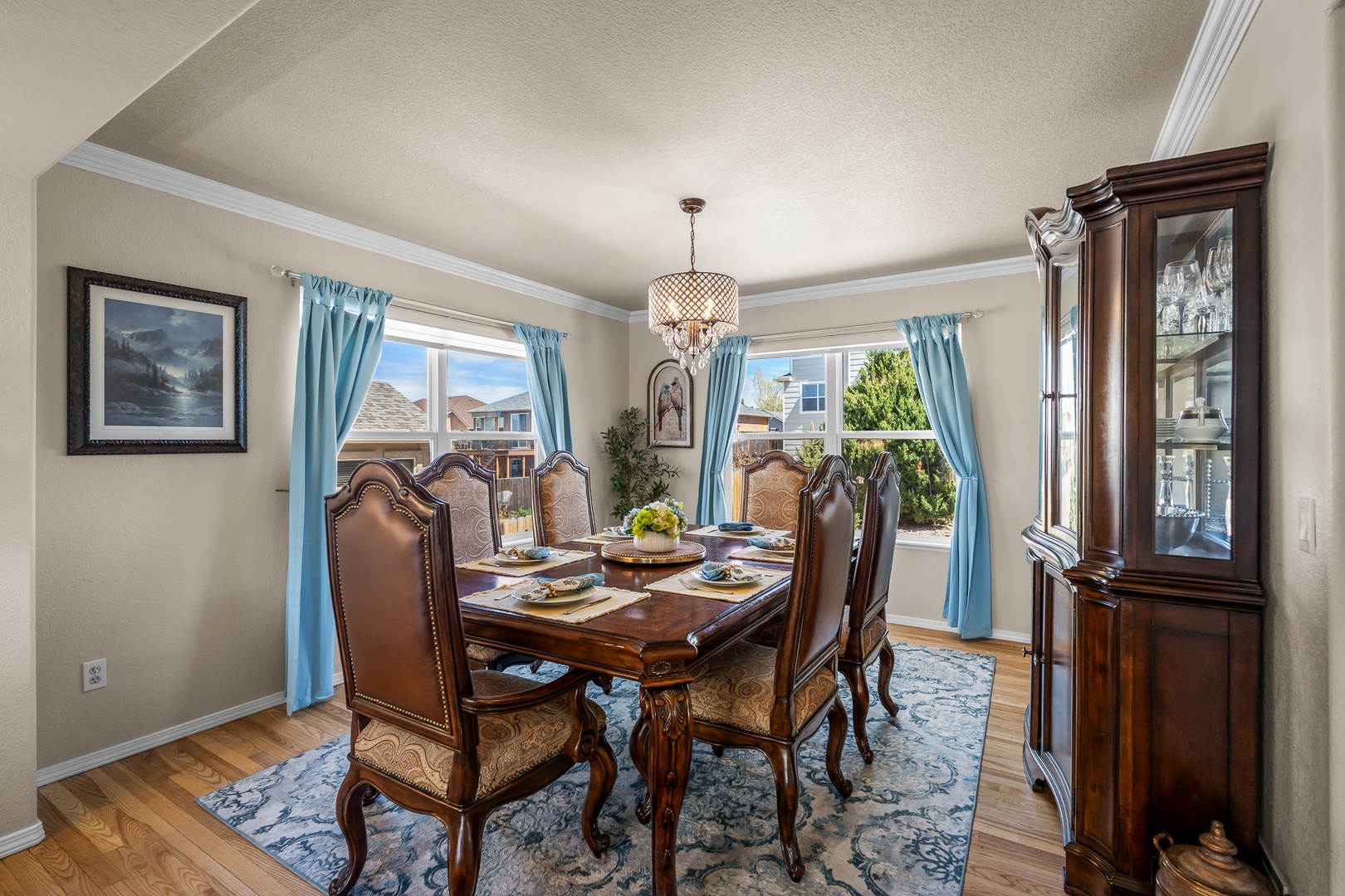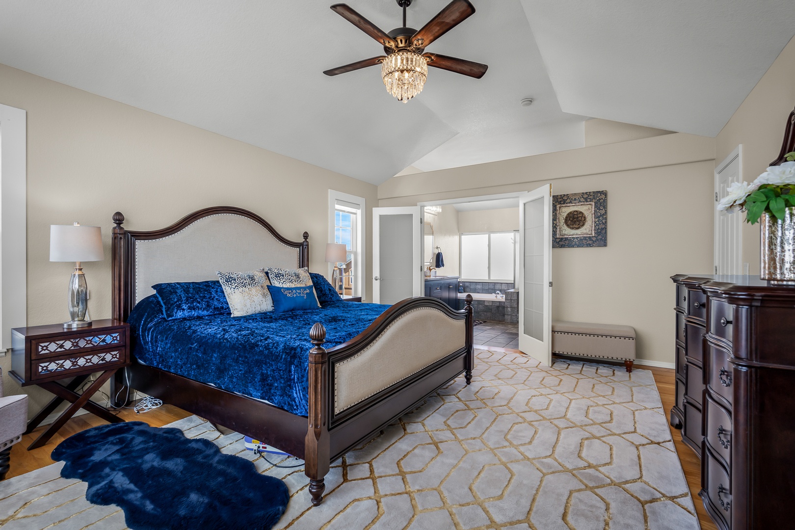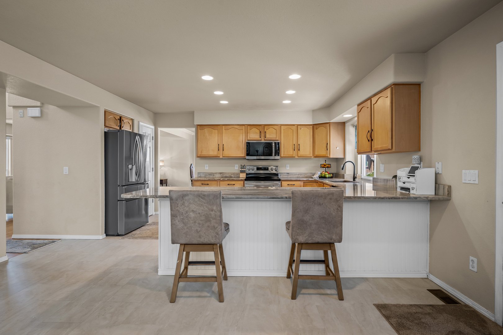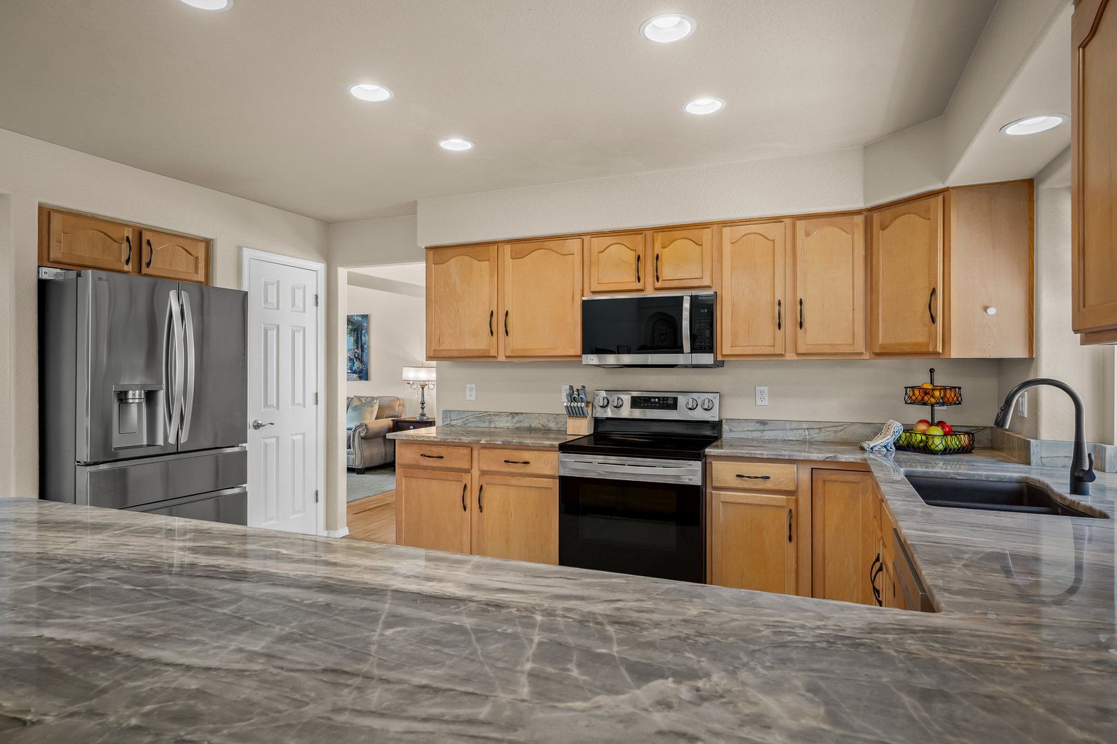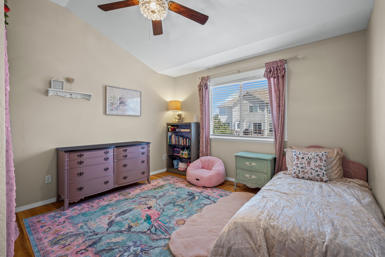 Step into this well-maintained south-facing stucco home in Indigo Ranch at Ridgeview, where mountain views welcome you from the front porch. A thoughtfully updated, spacious two-story offers a functional layout with inviting, well-connected living spaces throughout. The main level features hardwood floors, high ceilings, and updated finishes that create a clean, cohesive feel. The kitchen includes maple cabinetry, quartzite countertops, stainless steel appliances, and a pantry that flows seamlessly into the spacious great room, creating a layout that feels expansive and very functional. A wall of windows and 20-foot ceilings bring in abundant natural light, enhancing the sense of space, while built-ins and a gas fireplace with a custom mantle add comfortable everyday living. Convenient main-level powder room and laundry room. Upstairs, the vaulted primary suite includes hardwood flooring, a five-piece bath with soaking tub, dual vanities, and a walk-in closet. Two additional bedrooms and a loft-style balcony overlook into the great room, serving as a unique architectural feature and focal point. The finished basement offers 9-foot ceilings, a large recreation area, and a fourth bedroom with a walk-in closet and full bath, making it an ideal guest suite or private living space. The rear yard is private and fully fenced with mature landscaping and a large concrete patio, perfect for relaxing, enjoying summer BBQs, and hosting gatherings. Additional features include an oversized 3-car garage, central air, plantation shutters, updated lighting, a new roof installed in 2024, a radon mitigation system, some fresh interior paint, exterior repainted, and a newer kitchen floor. Located near parks, trails, schools, and shopping along the Powers Corridor with convenient access to Peterson and Schriever Space Force Bases. This home checks all the boxes with space, updates, and location—schedule your showing and see why this one stands out the moment you walk in! .