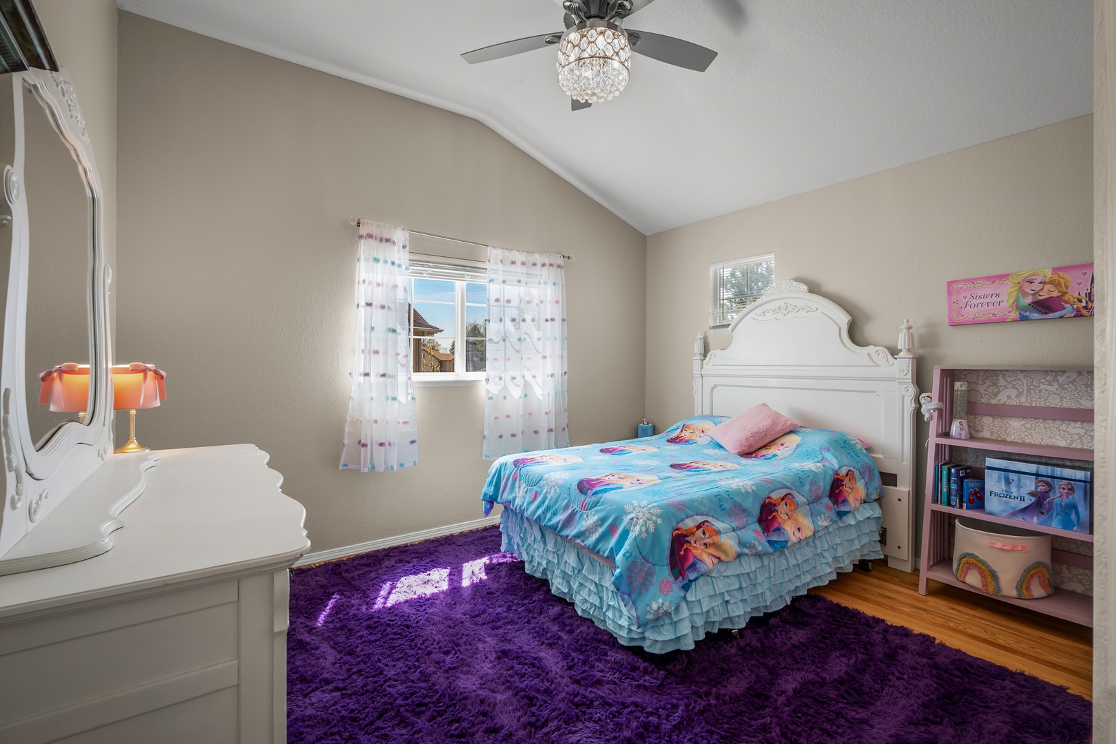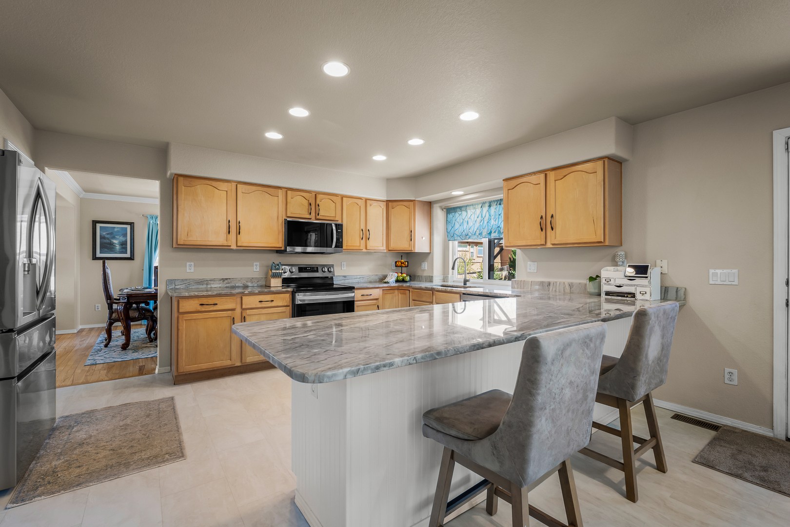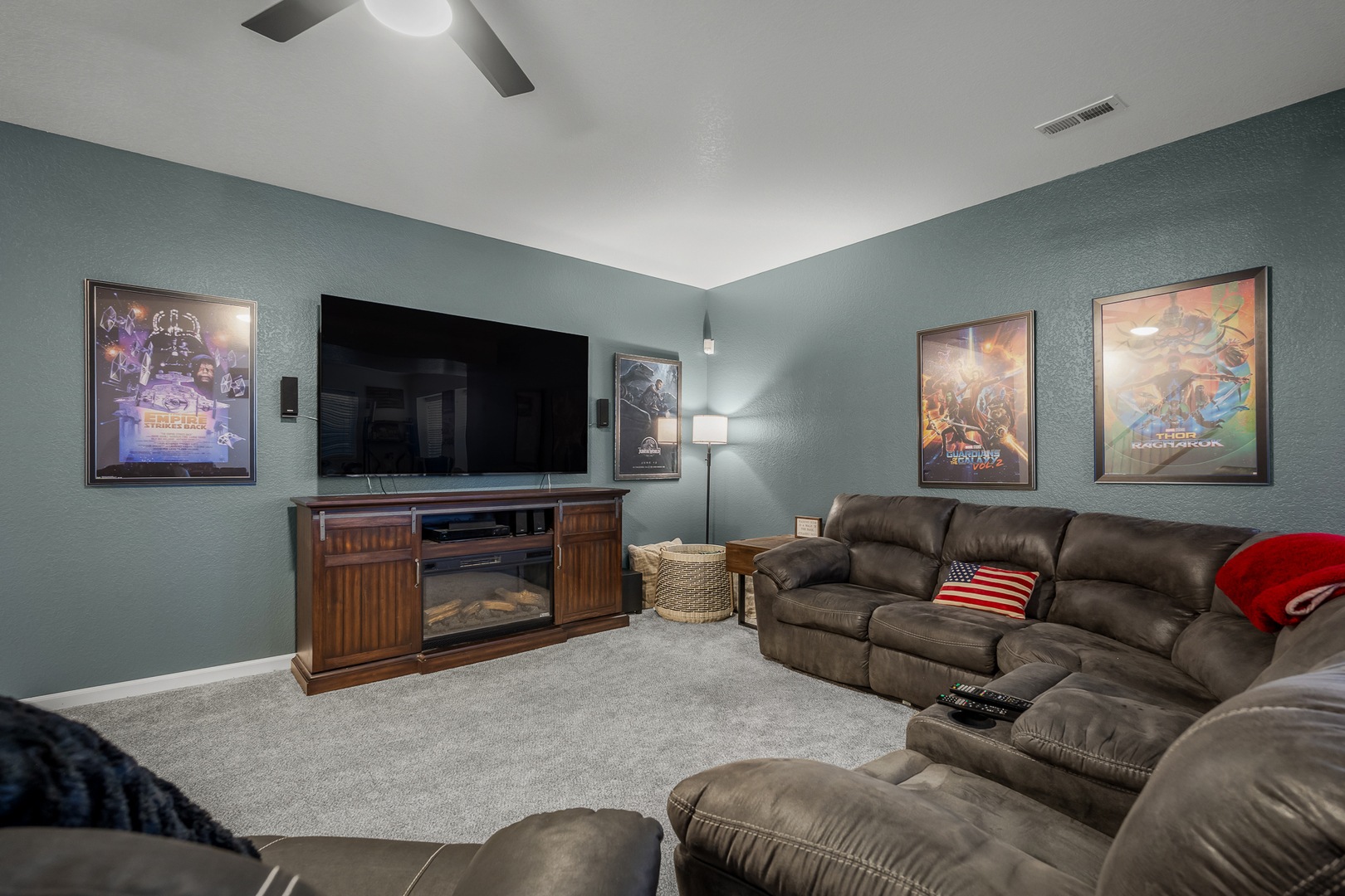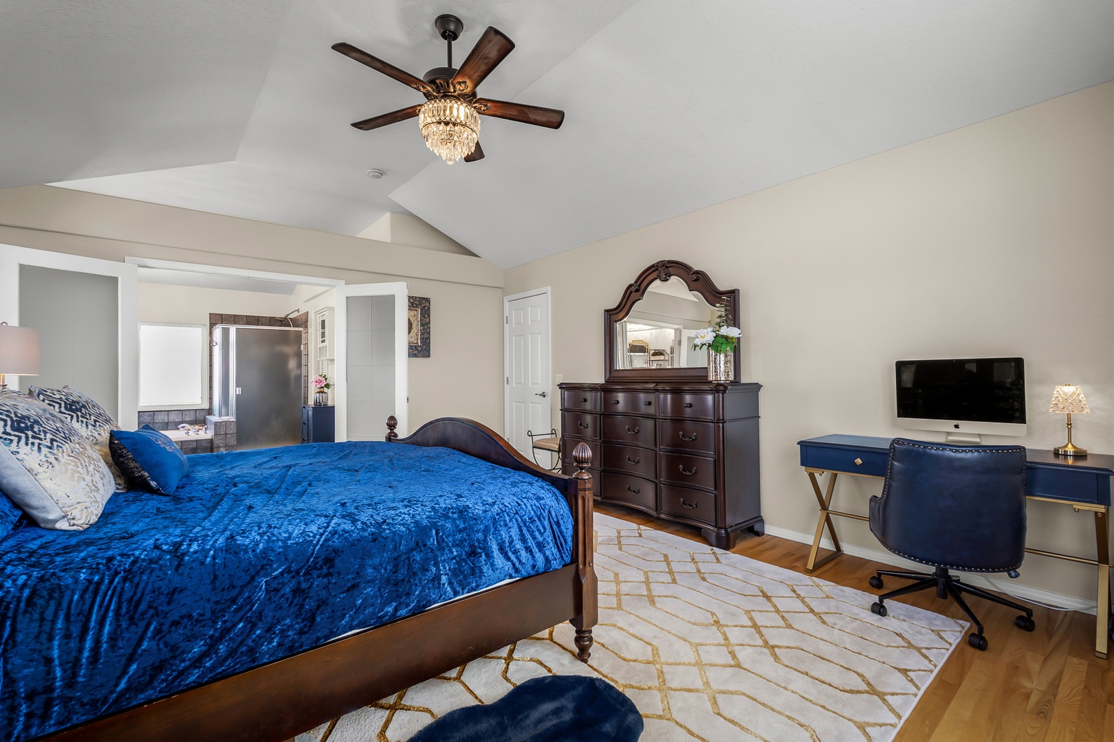 Step into this well-maintained south-facing stucco home in Indigo Ranch at Ridgeview, where mountain views welcome you from the front porch. A thoughtfully updated, spacious two-story offers a functional layout with inviting, well-connected living spaces throughout. The main level features hardwood floors, high ceilings, and updated finishes that create a clean, cohesive feel. The kitchen includes maple cabinetry, quartzite countertops, stainless steel appliances, and a pantry that flows seamlessly into the spacious great room, creating a layout that feels expansive and very functional. A wall of windows and 20-foot ceilings bring in abundant natural light, enhancing the sense of space, while built-ins and a gas fireplace with a custom mantle add comfortable everyday living. Convenient main-level powder room and laundry room. Upstairs, the vaulted primary suite includes hardwood flooring, a five-piece bath with soaking tub, dual vanities, and a walk-in closet. Two additional bedrooms and a loft-style balcony overlook into the great room, serving as a unique architectural feature and focal point. The finished basement offers 9-foot ceilings, a large recreation area, and a fourth bedroom with a walk-in closet and full bath, making it an ideal guest suite or private living space. The rear yard is private and fully fenced with mature landscaping and a large concrete patio, perfect for relaxing, enjoying summer BBQs, and hosting gatherings. Additional features include an oversized 3-car garage, central air, plantation shutters, updated lighting, a new roof installed in 2024, a radon mitigation system, some fresh interior paint, exterior repainted, and a newer kitchen floor. Located near parks, trails, schools, and shopping along the Powers Corridor with convenient access to Peterson and Schriever Space Force Bases. This home checks all the boxes with space, updates, and location—schedule your showing and see why this one stands out the moment you walk in! .