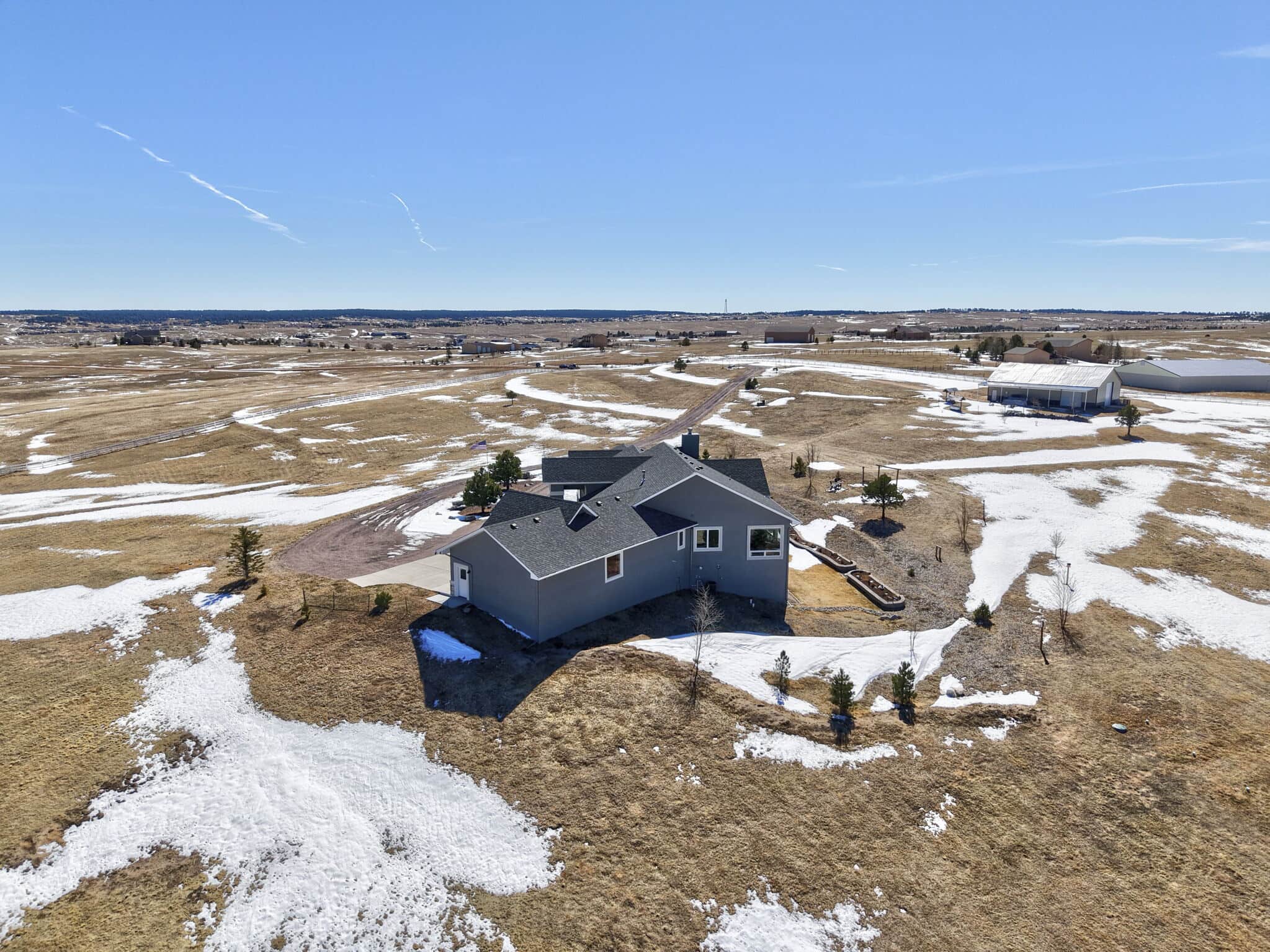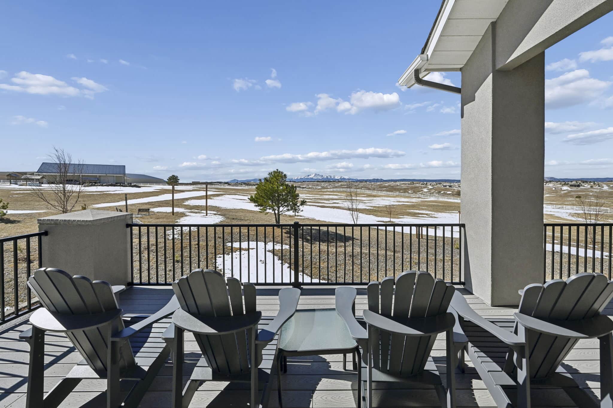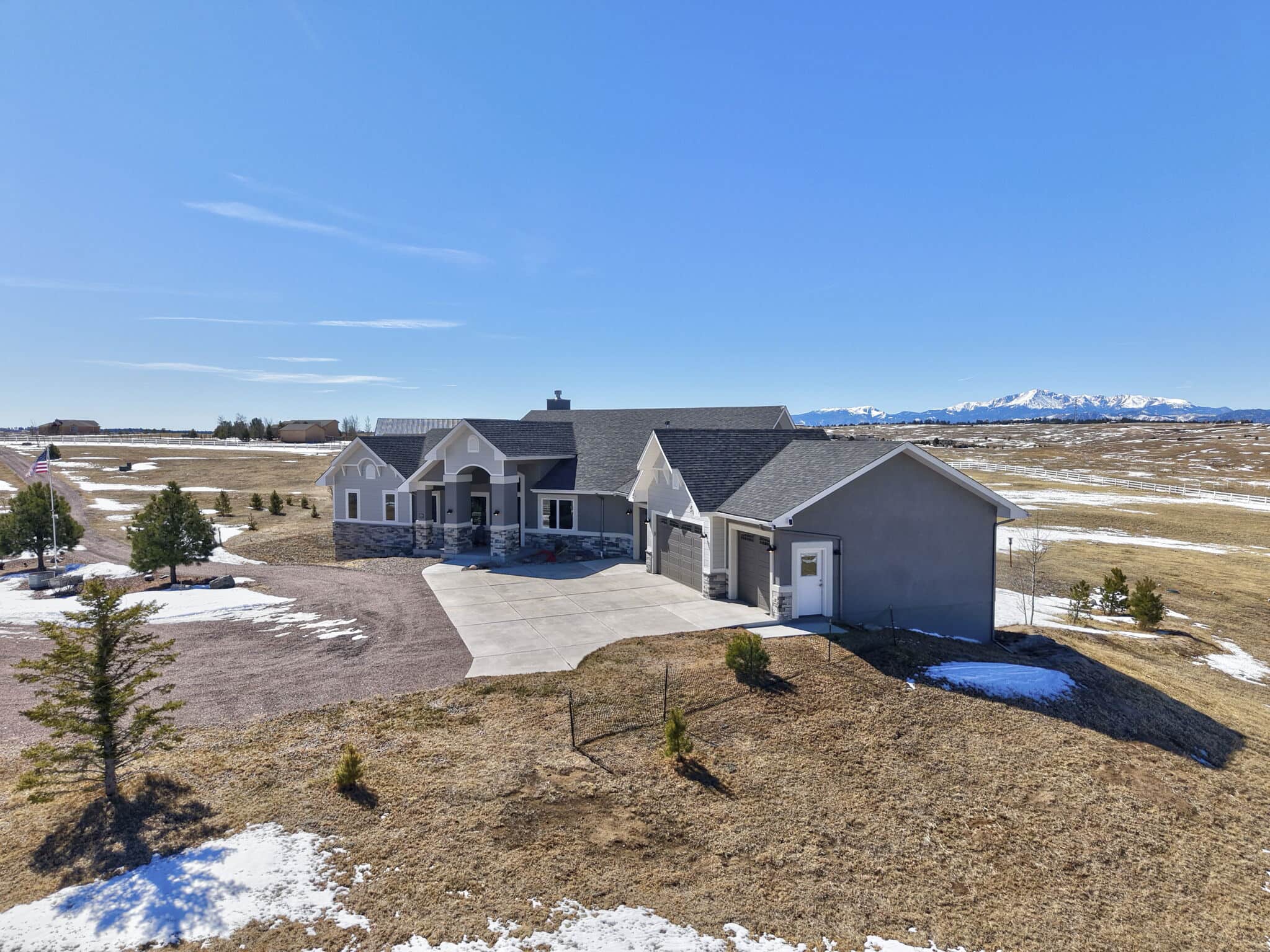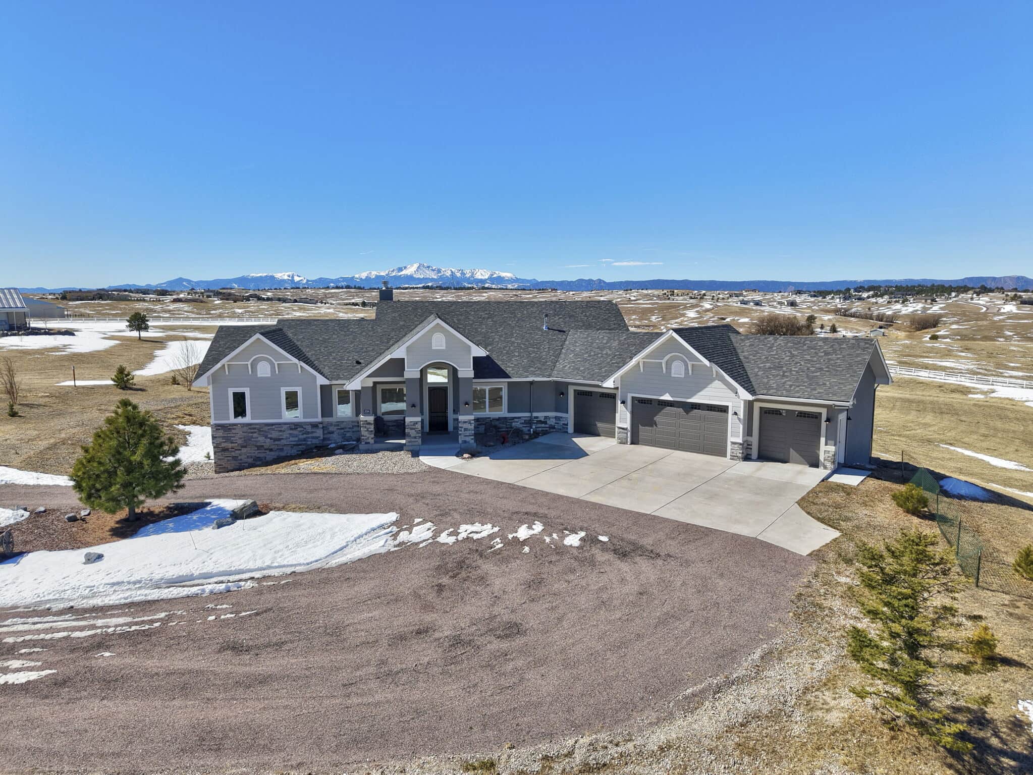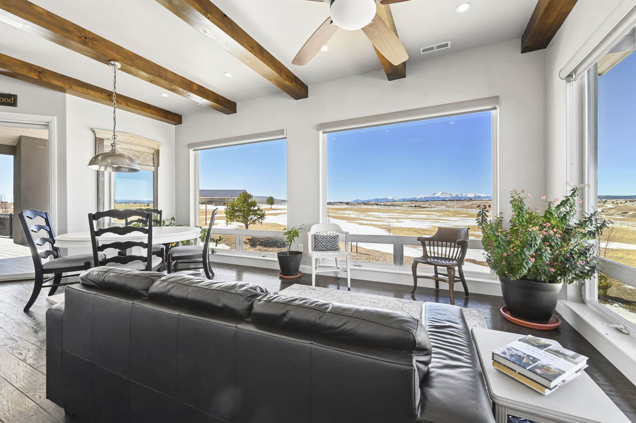 Beautiful 5-bedroom, 7-bath custom ranch estate set on 36 acres with breathtaking 360° views, including stunning views of Pikes Peak. This exceptional property offers the perfect blend of luxury living and equestrian functionality. The main level features hand-scraped wood floors, an open floor plan, and a spacious family room with a gas fireplace. The gourmet kitchen includes granite countertops, stainless steel appliances, ample cabinetry, and a large walk-in pantry. A spectacular sunroom with 180° views and wet bar/coffee bar walks out to a partially covered composite deck with metal railing—perfect for enjoying Colorado sunsets. The primary suite offers private deck access, beautiful Pikes Peak views, hand-scraped wood floors, and a spa-style bath with dual vanities, soaking tub, walk-in shower, and large walk-in closet with attached laundry. The walk-out basement level features high ceilings, a wood-burning fireplace, wet bar, private playroom, additional laundry, and three bedrooms—each with its own three-quarter bath, walk-in shower, and walk-in closet. Outside you’ll find a large barn with horse stalls, tack room, pass-through doors, and additional overhead access. The top portion of the property is enclosed with vinyl fencing, ideal for horses or livestock. Paid-off solar panels power both the home and barn. A rare opportunity to own a private Colorado ranch estate with panoramic views, luxury finishes, and outstanding equestrian amenities. Located close to Highway 105 with access to the highly regarded Monument Academy Charter Schools serving elementary through high school.