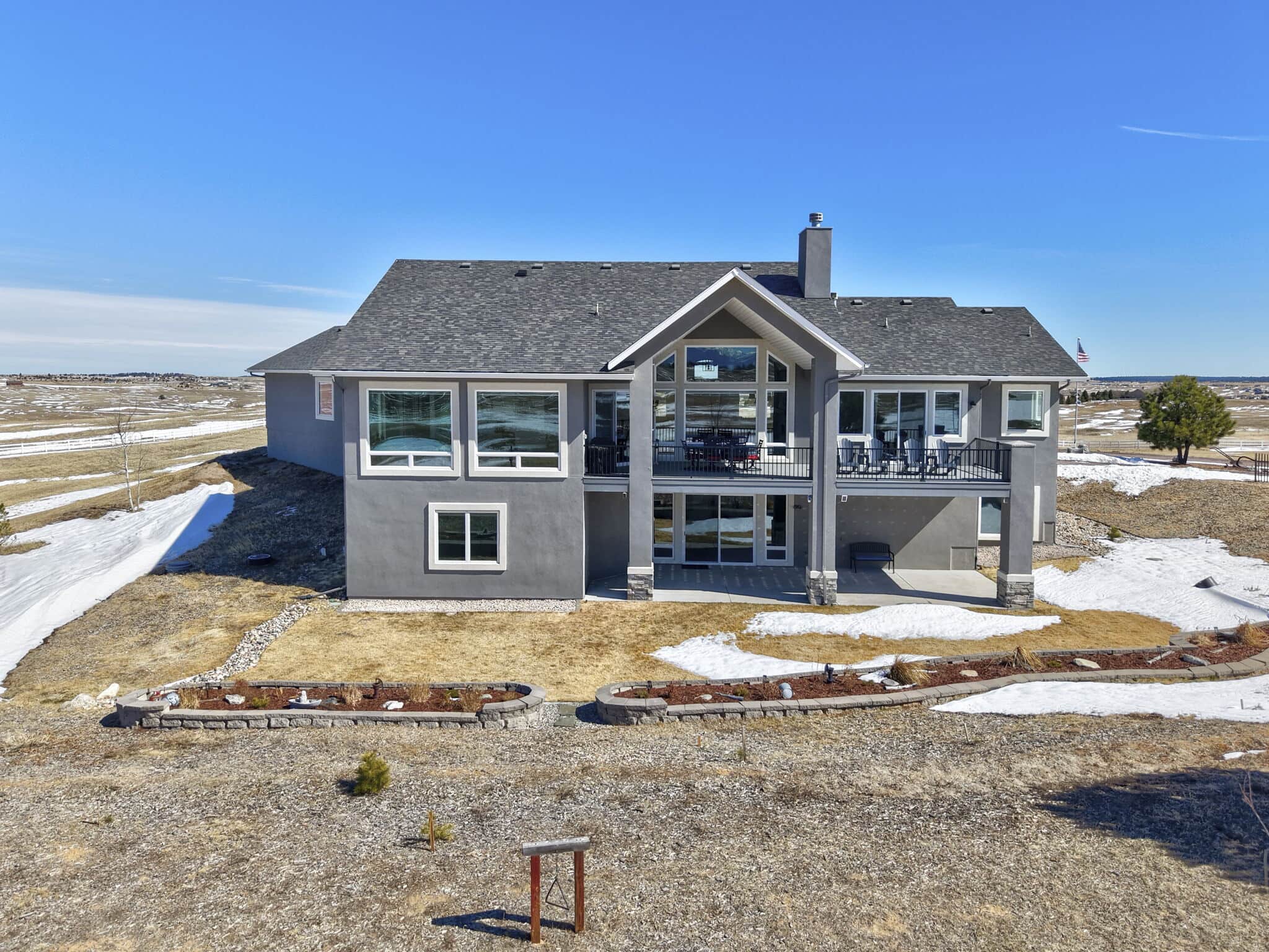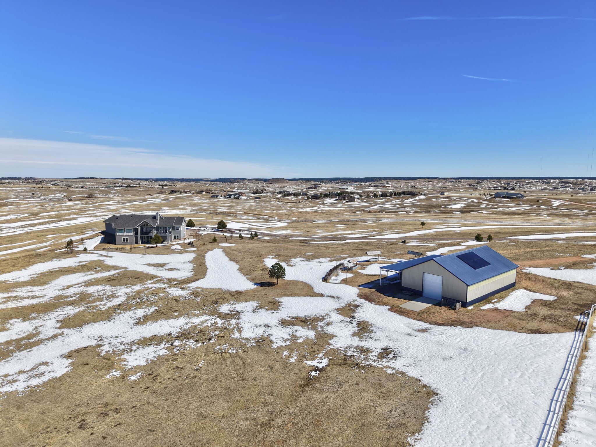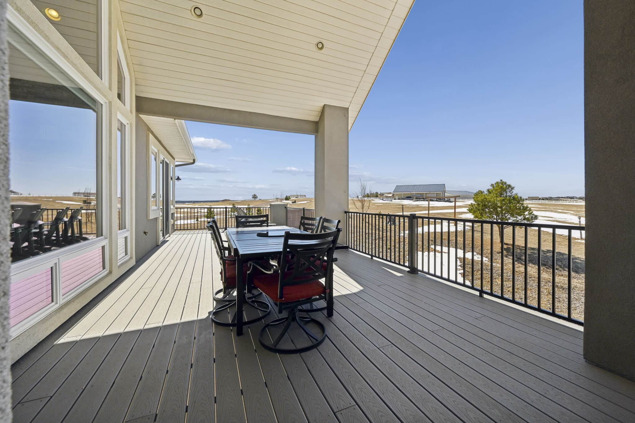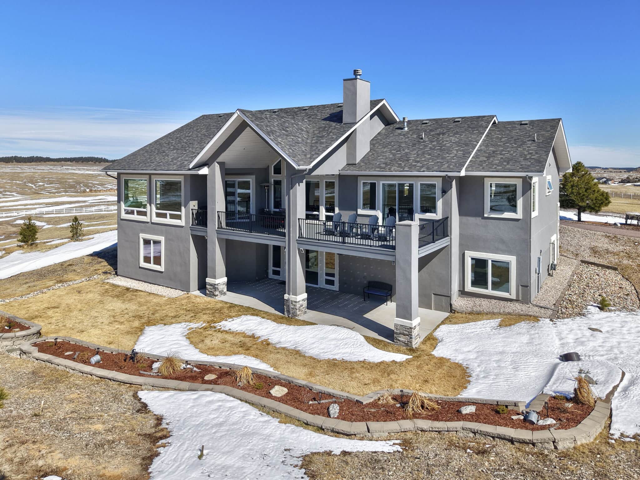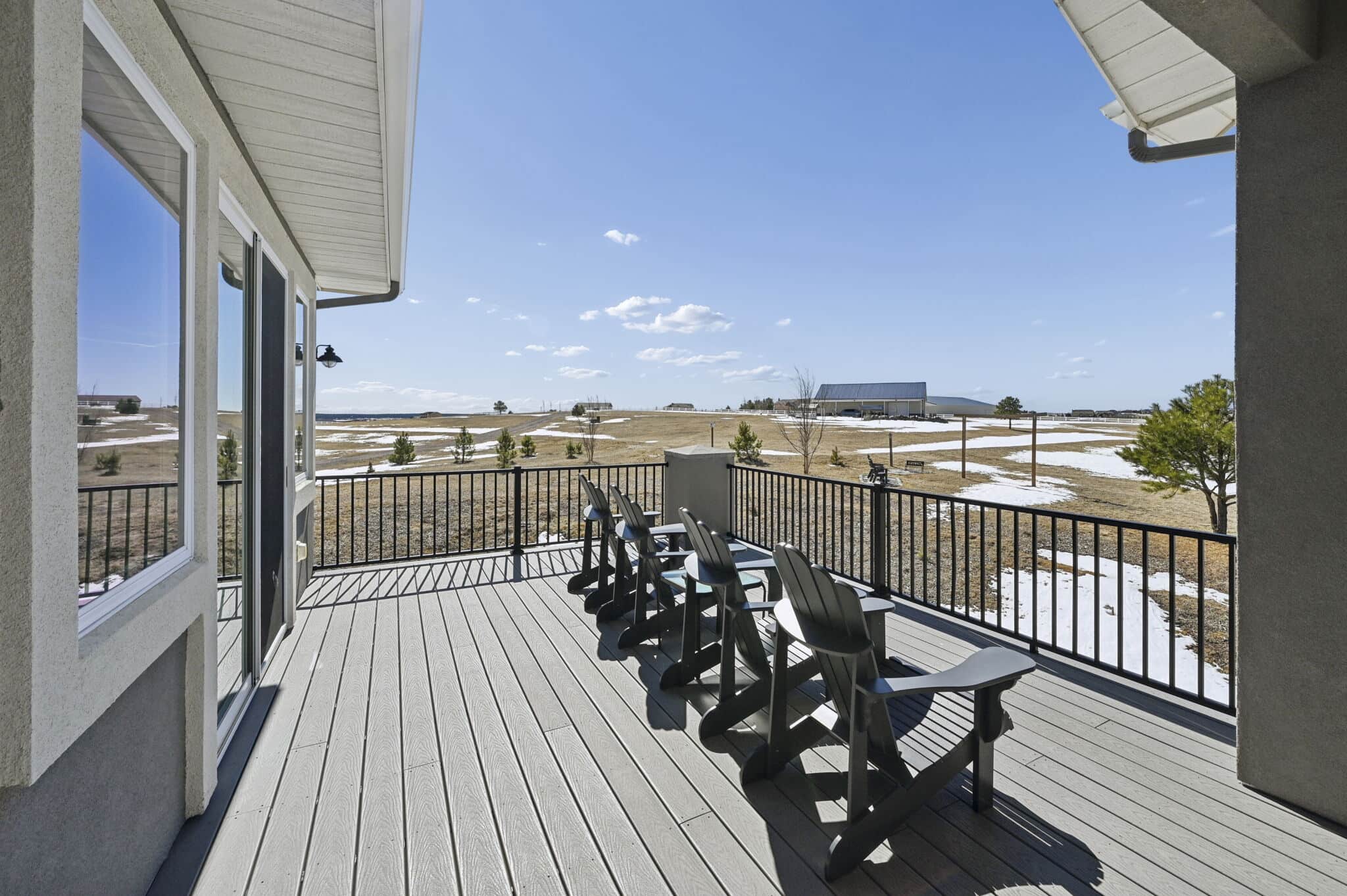 Beautiful 5-bedroom, 7-bath custom ranch estate set on 36 acres with breathtaking 360° views, including stunning views of Pikes Peak. This exceptional property offers the perfect blend of luxury living and equestrian functionality. The main level features hand-scraped wood floors, an open floor plan, and a spacious family room with a gas fireplace. The gourmet kitchen includes granite countertops, stainless steel appliances, ample cabinetry, and a large walk-in pantry. A spectacular sunroom with 180° views and wet bar/coffee bar walks out to a partially covered composite deck with metal railing—perfect for enjoying Colorado sunsets. The primary suite offers private deck access, beautiful Pikes Peak views, hand-scraped wood floors, and a spa-style bath with dual vanities, soaking tub, walk-in shower, and large walk-in closet with attached laundry. The walk-out basement level features high ceilings, a wood-burning fireplace, wet bar, private playroom, additional laundry, and three bedrooms—each with its own three-quarter bath, walk-in shower, and walk-in closet. Outside you’ll find a large barn with horse stalls, tack room, pass-through doors, and additional overhead access. The top portion of the property is enclosed with vinyl fencing, ideal for horses or livestock. Paid-off solar panels power both the home and barn. A rare opportunity to own a private Colorado ranch estate with panoramic views, luxury finishes, and outstanding equestrian amenities. Located close to Highway 105 with access to the highly regarded Monument Academy Charter Schools serving elementary through high school.