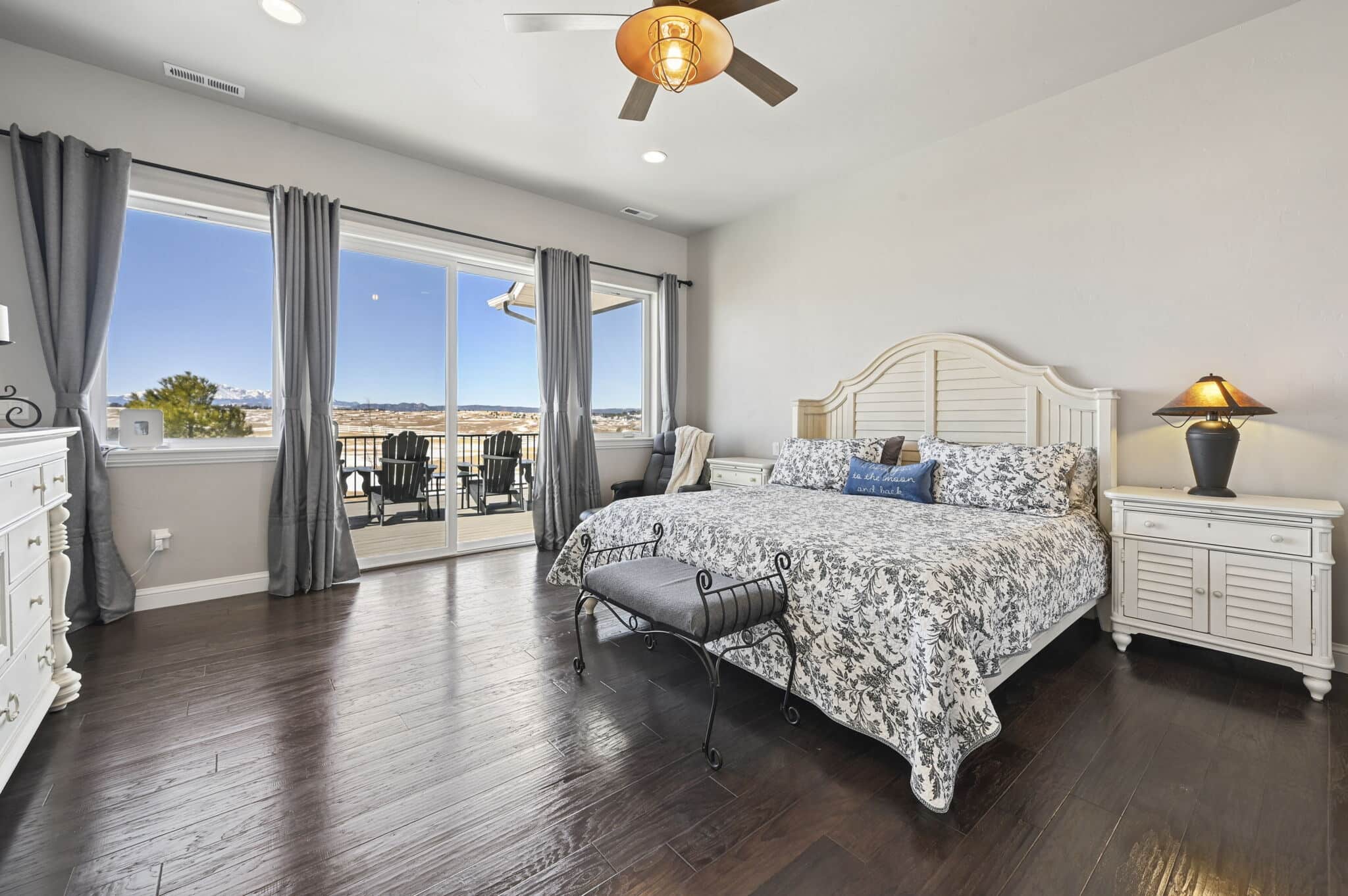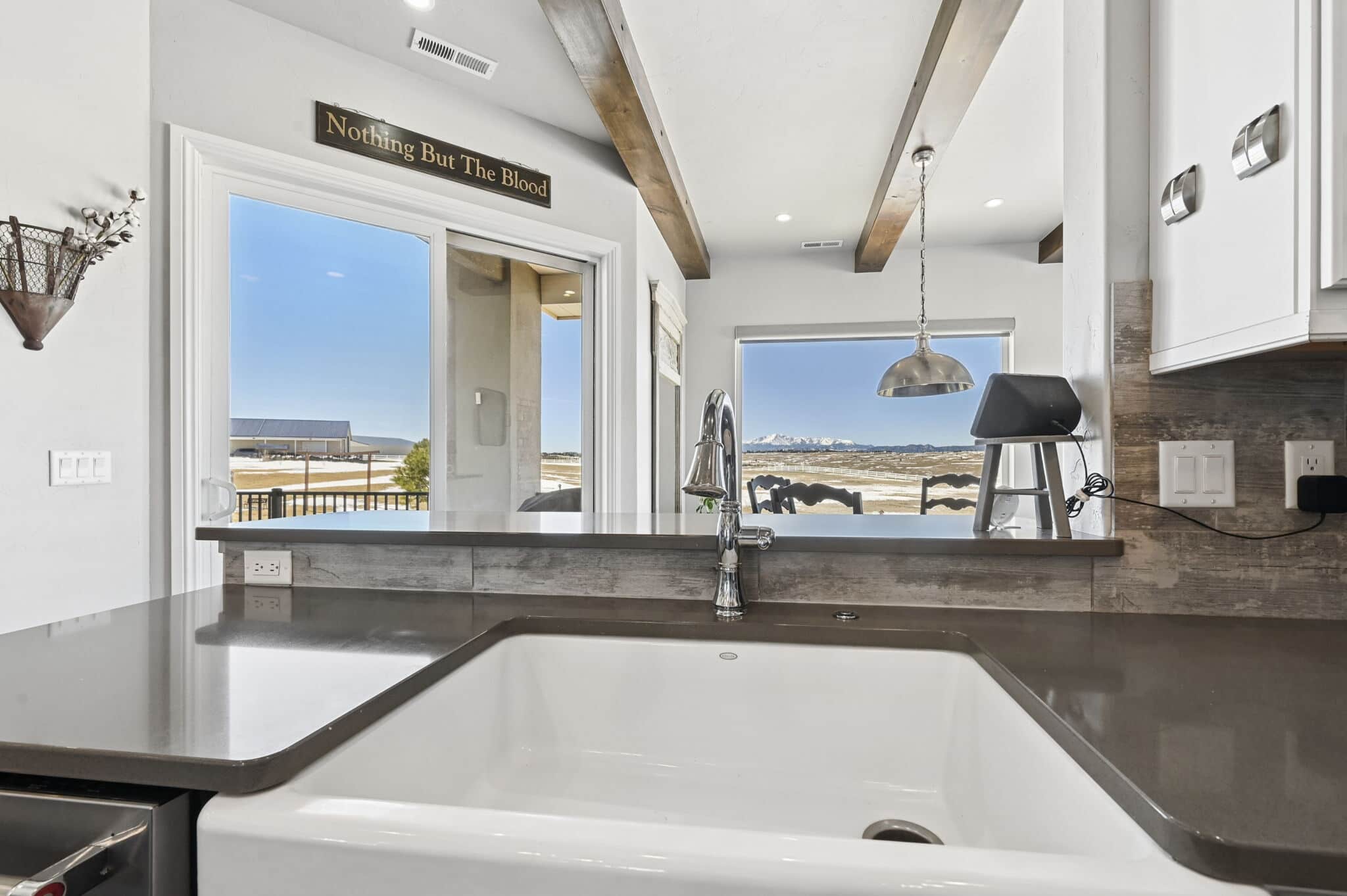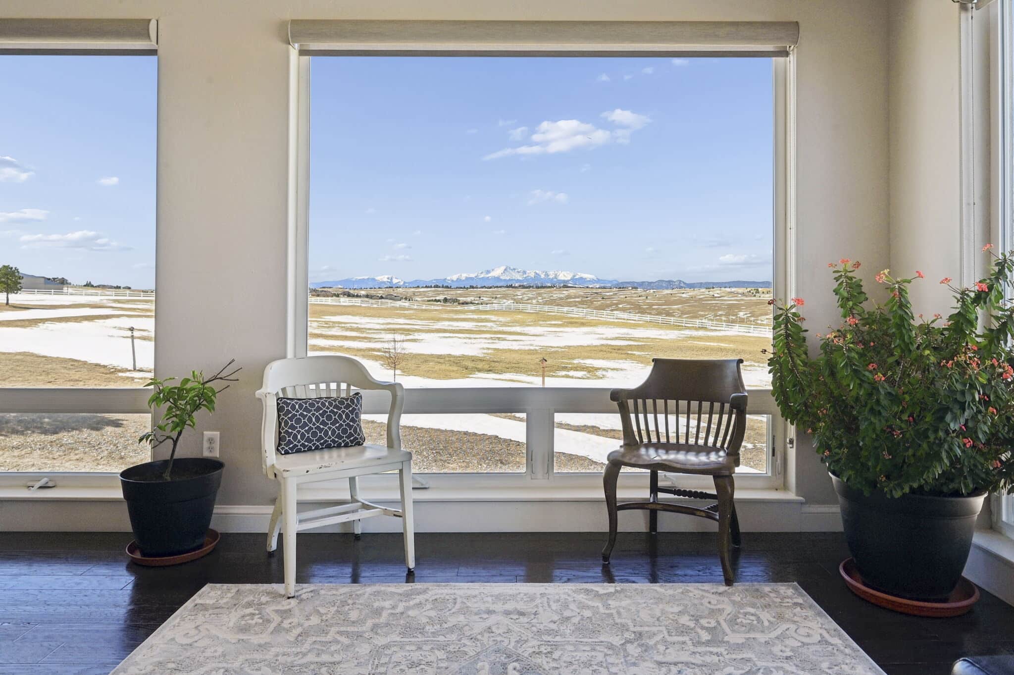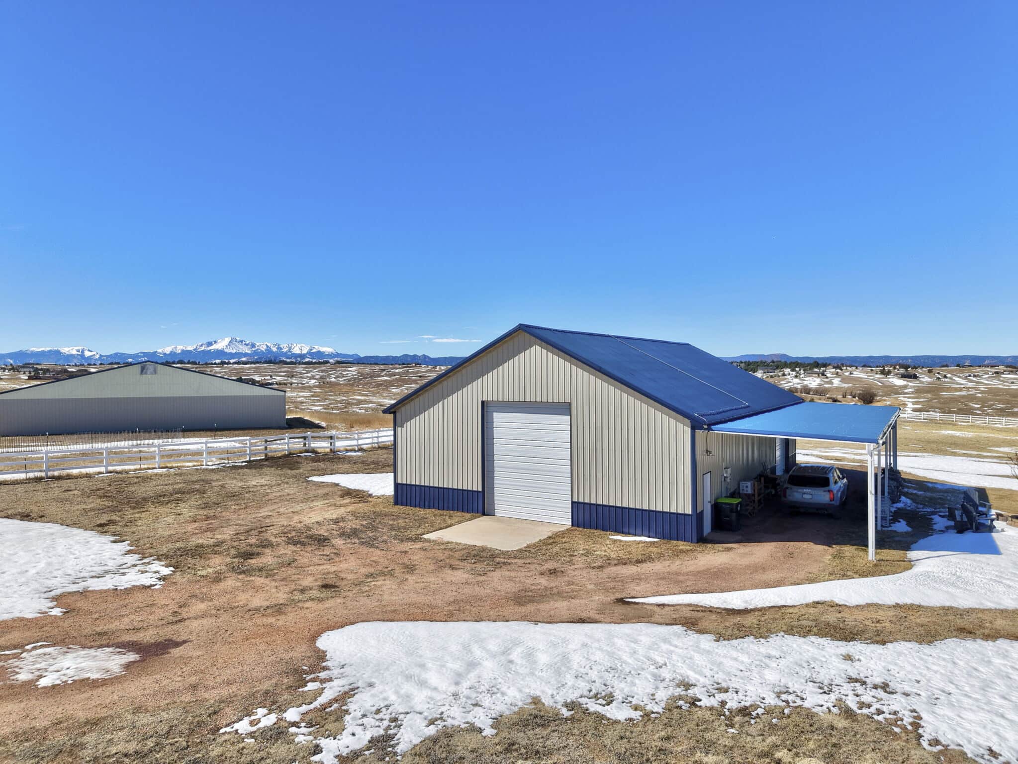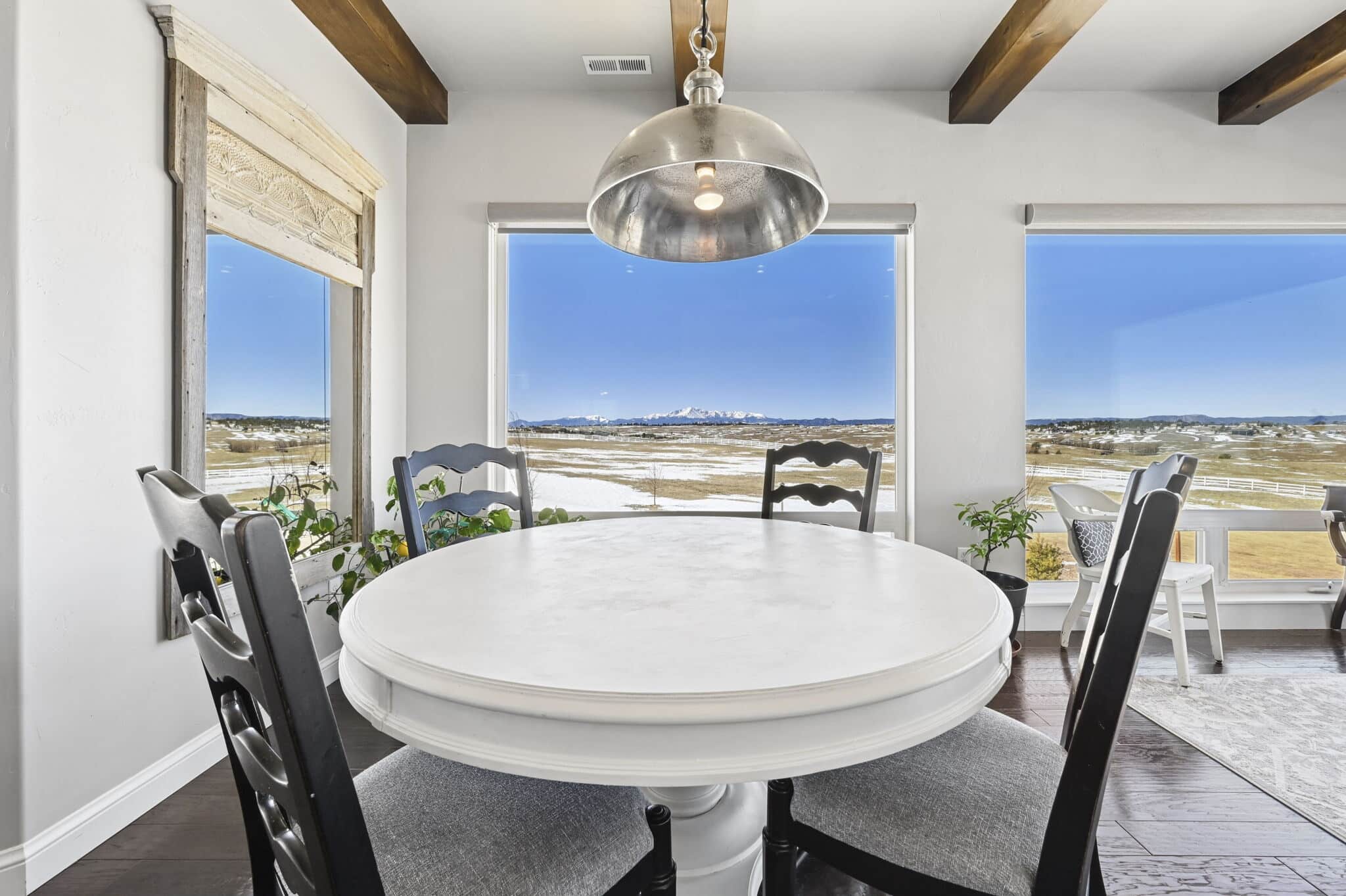 Beautiful 5-bedroom, 7-bath custom ranch estate set on 36 acres with breathtaking 360° views, including stunning views of Pikes Peak. This exceptional property offers the perfect blend of luxury living and equestrian functionality. The main level features hand-scraped wood floors, an open floor plan, and a spacious family room with a gas fireplace. The gourmet kitchen includes granite countertops, stainless steel appliances, ample cabinetry, and a large walk-in pantry. A spectacular sunroom with 180° views and wet bar/coffee bar walks out to a partially covered composite deck with metal railing—perfect for enjoying Colorado sunsets. The primary suite offers private deck access, beautiful Pikes Peak views, hand-scraped wood floors, and a spa-style bath with dual vanities, soaking tub, walk-in shower, and large walk-in closet with attached laundry. The walk-out basement level features high ceilings, a wood-burning fireplace, wet bar, private playroom, additional laundry, and three bedrooms—each with its own three-quarter bath, walk-in shower, and walk-in closet. Outside you’ll find a large barn with horse stalls, tack room, pass-through doors, and additional overhead access. The top portion of the property is enclosed with vinyl fencing, ideal for horses or livestock. Paid-off solar panels power both the home and barn. A rare opportunity to own a private Colorado ranch estate with panoramic views, luxury finishes, and outstanding equestrian amenities. Located close to Highway 105 with access to the highly regarded Monument Academy Charter Schools serving elementary through high school.