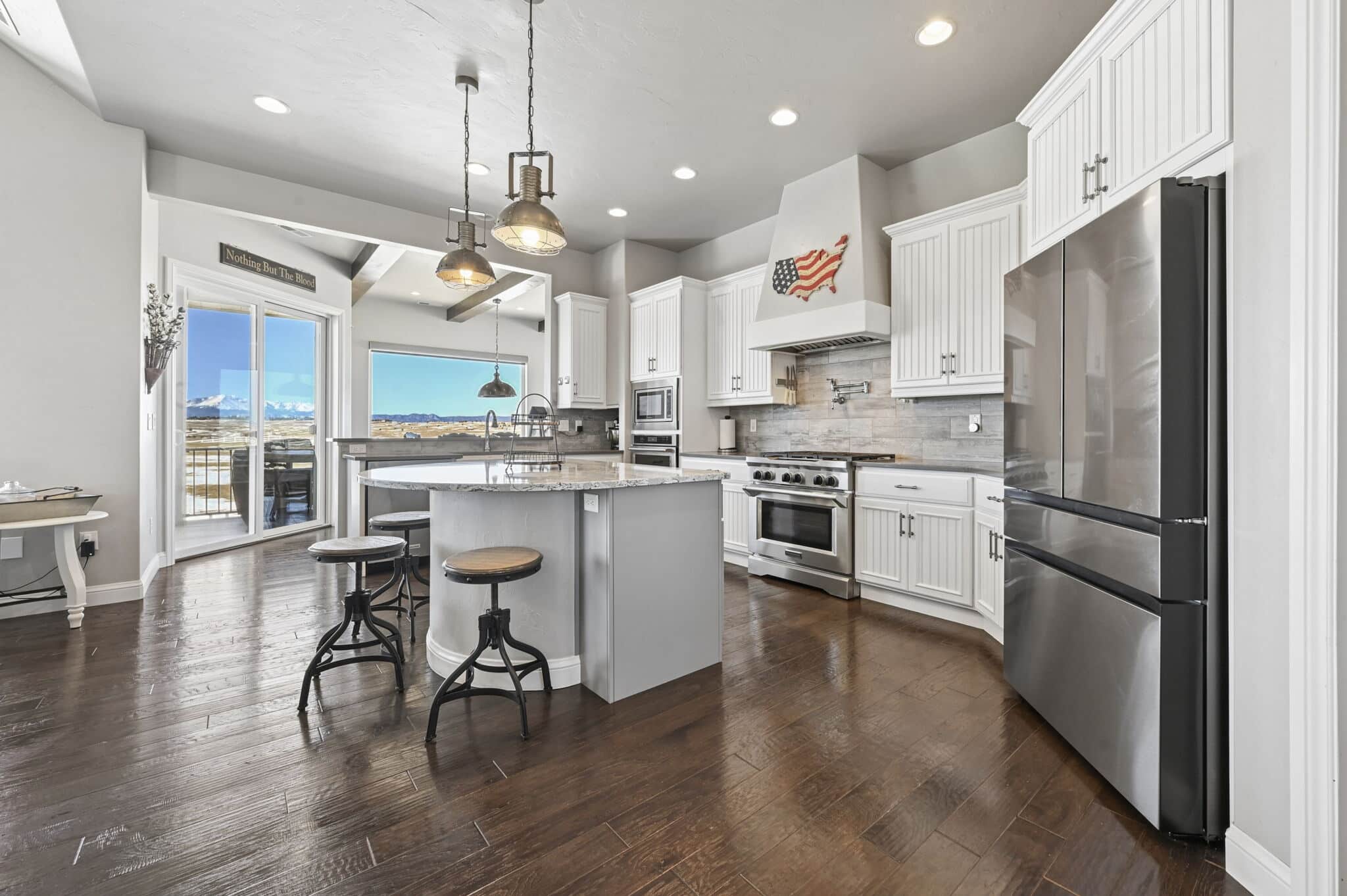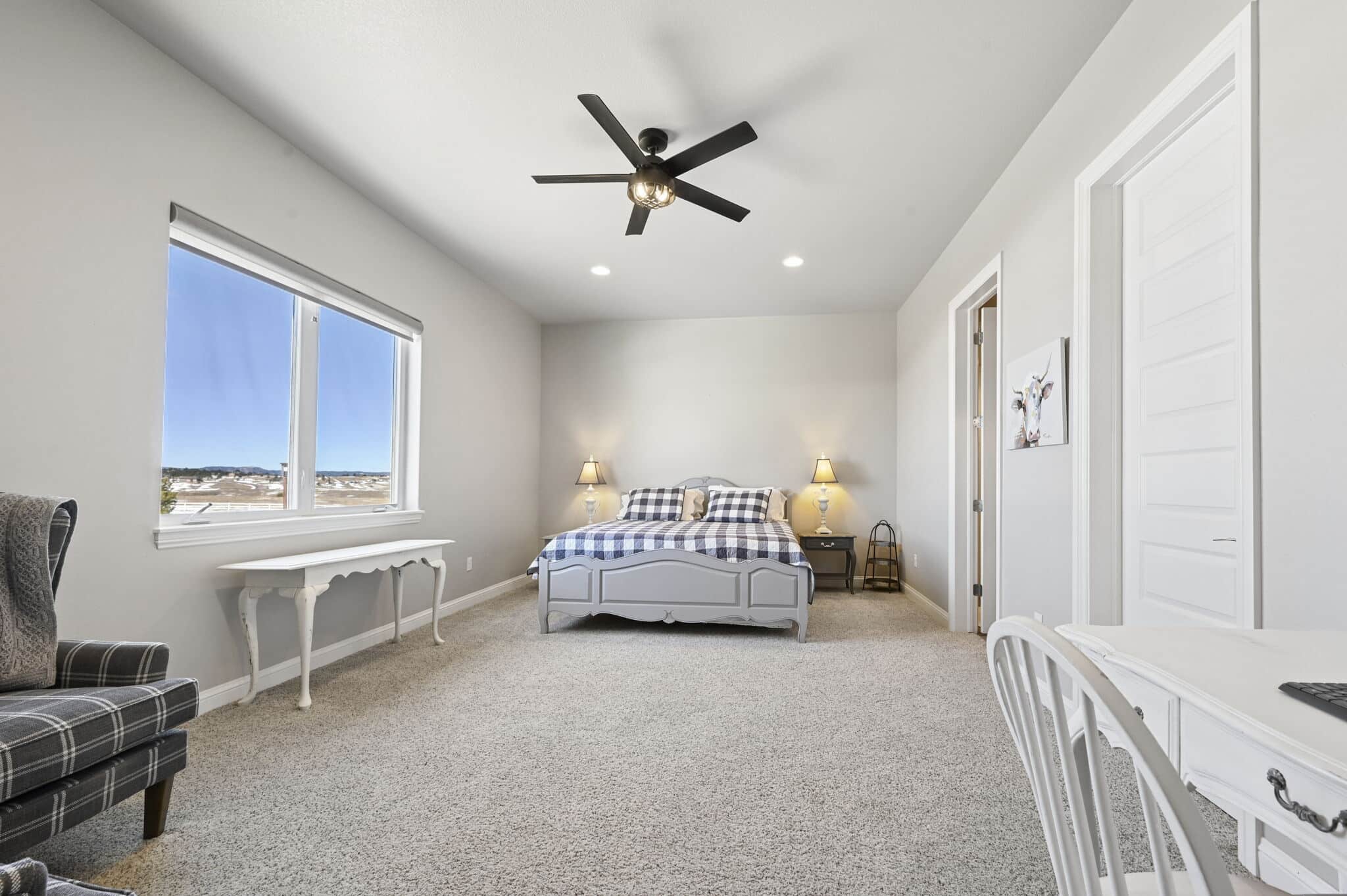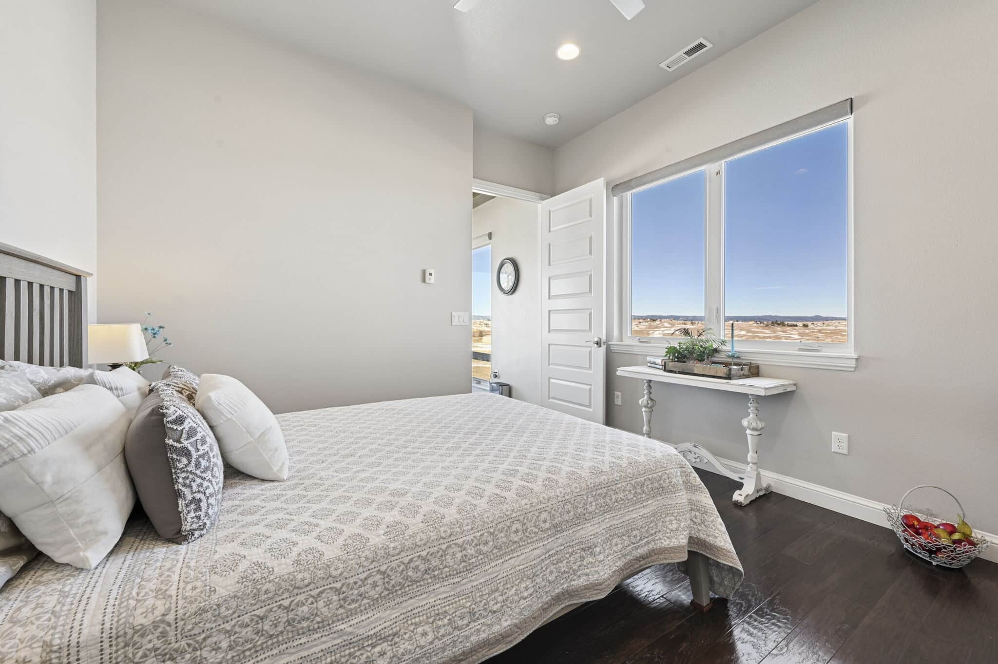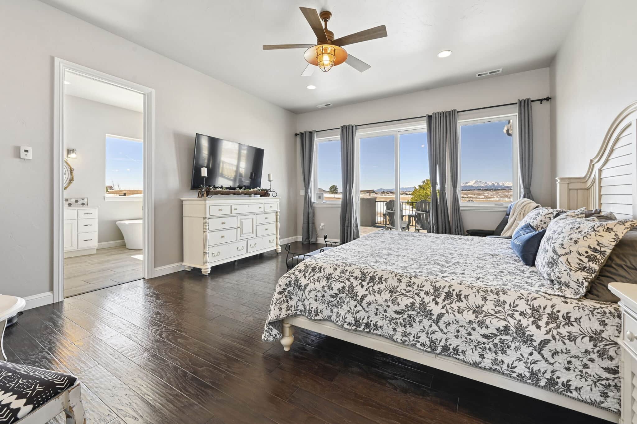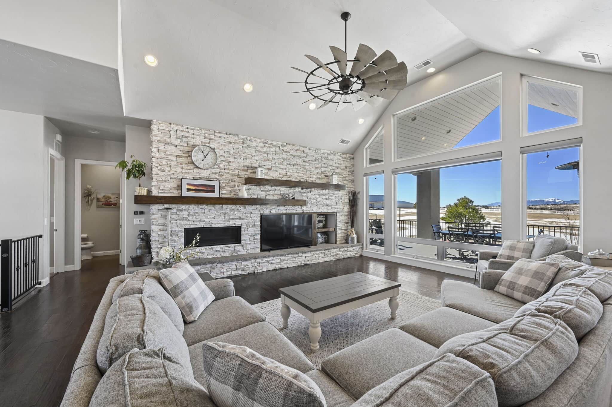 Beautiful 5-bedroom, 7-bath custom ranch estate set on 36 acres with breathtaking 360° views, including stunning views of Pikes Peak. This exceptional property offers the perfect blend of luxury living and equestrian functionality. The main level features hand-scraped wood floors, an open floor plan, and a spacious family room with a gas fireplace. The gourmet kitchen includes granite countertops, stainless steel appliances, ample cabinetry, and a large walk-in pantry. A spectacular sunroom with 180° views and wet bar/coffee bar walks out to a partially covered composite deck with metal railing—perfect for enjoying Colorado sunsets. The primary suite offers private deck access, beautiful Pikes Peak views, hand-scraped wood floors, and a spa-style bath with dual vanities, soaking tub, walk-in shower, and large walk-in closet with attached laundry. The walk-out basement level features high ceilings, a wood-burning fireplace, wet bar, private playroom, additional laundry, and three bedrooms—each with its own three-quarter bath, walk-in shower, and walk-in closet. Outside you’ll find a large barn with horse stalls, tack room, pass-through doors, and additional overhead access. The top portion of the property is enclosed with vinyl fencing, ideal for horses or livestock. Paid-off solar panels power both the home and barn. A rare opportunity to own a private Colorado ranch estate with panoramic views, luxury finishes, and outstanding equestrian amenities. Located close to Highway 105 with access to the highly regarded Monument Academy Charter Schools serving elementary through high school.