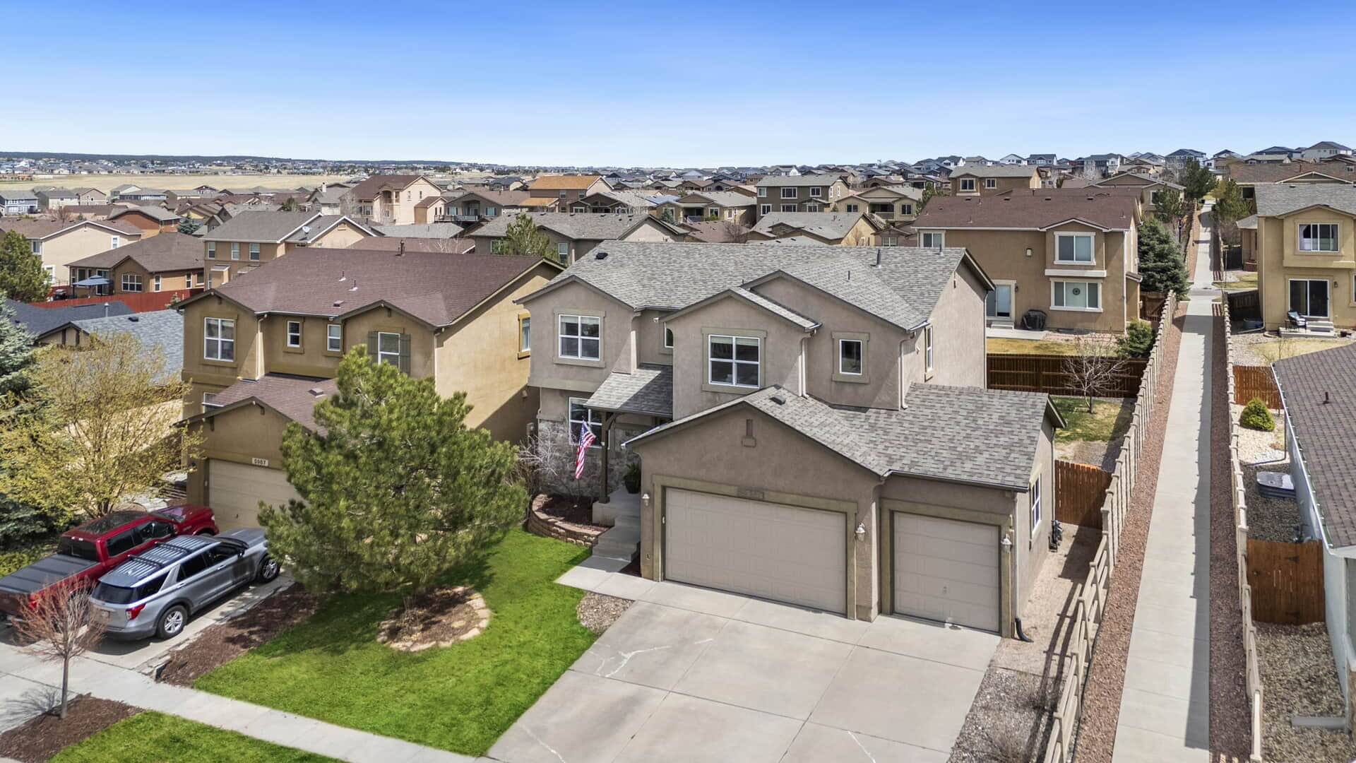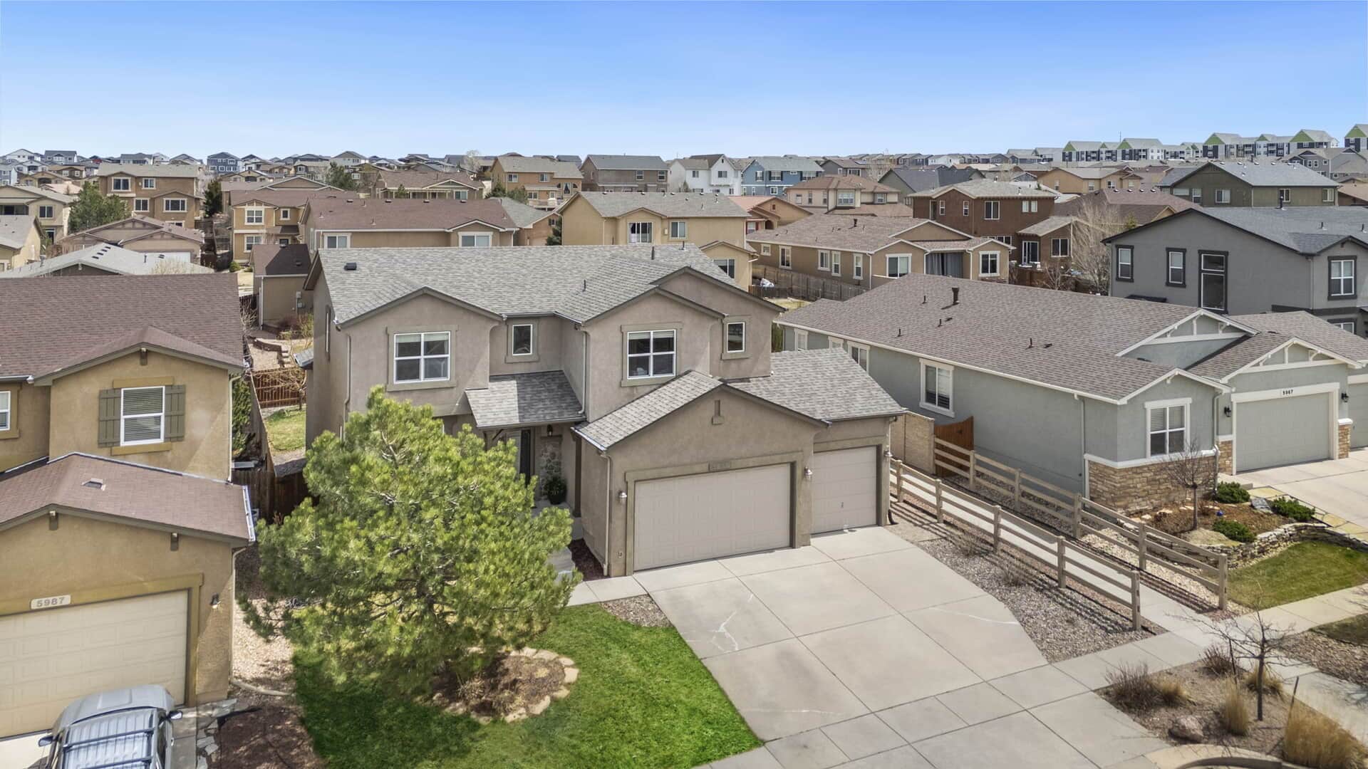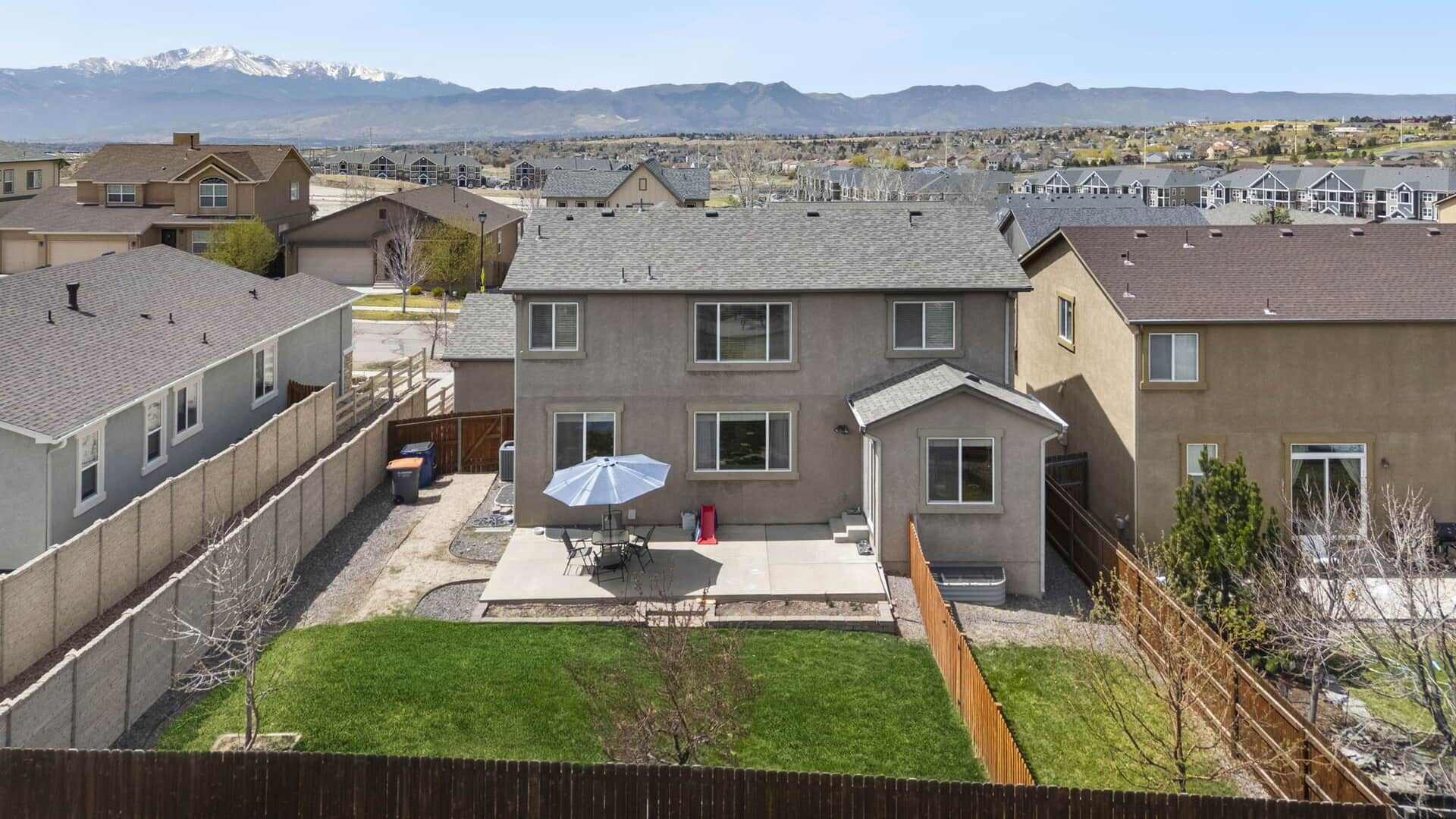 **Be sure to view the Virtual Tour & Custom Video links above**Welcome to your next chapter in the highly desirable Cumbre Vista neighborhood where great neighbors, mountain views, and top-rated District 20 schools create the perfect setting for Colorado living. This beautiful 5-bedroom, 4-bathroom home offers over 3,500 sq ft of well-designed space that blends modern upgrades with comfort. Whether you’re hosting friends or settling in for a quiet evening, this home is built for real life. Step inside the light-filled, open-concept main level, ideal for both everyday living and entertaining. The kitchen is the heart of the home, featuring newer stainless steel appliances, composite countertops, and a large center island perfect for baking, catching up on homework, or catching up friends/family. Meals can be enjoyed in the eat-in kitchen or in the formal dining room. The living room, complete with a cozy fireplace and big windows, feels bright and relaxing. A main-floor flex room can be used as a home office, playroom, or guest suite, whatever best fits your lifestyle. Upstairs, you’ll find four bedrooms, including a serene primary suite with a spa-like 5-piece bath and walk-in closet. You’ll love the convenience of having the laundry room upstairs, right where it’s needed most. The finished basement includes a large rec room, an additional bedroom and full bath, a dedicated home gym, and tons of storage. Need a 6th bedroom? The gym can be converted easily. Outside, enjoy a fully fenced backyard with mature landscaping, a separate dog run, and space for BBQs and/or play. You will love the city and mountain views from the front porch and 2 of the upstairs bedrooms. Extras include a 3-car oversized garage, central A/C, and easy access to Powers Blvd, parks, trails, shopping, and dining. The roof has been verified and comes with a 5 year cert from a local roofer. Looking for a place to call your very own? This is it! Call your agent and book your showing today!