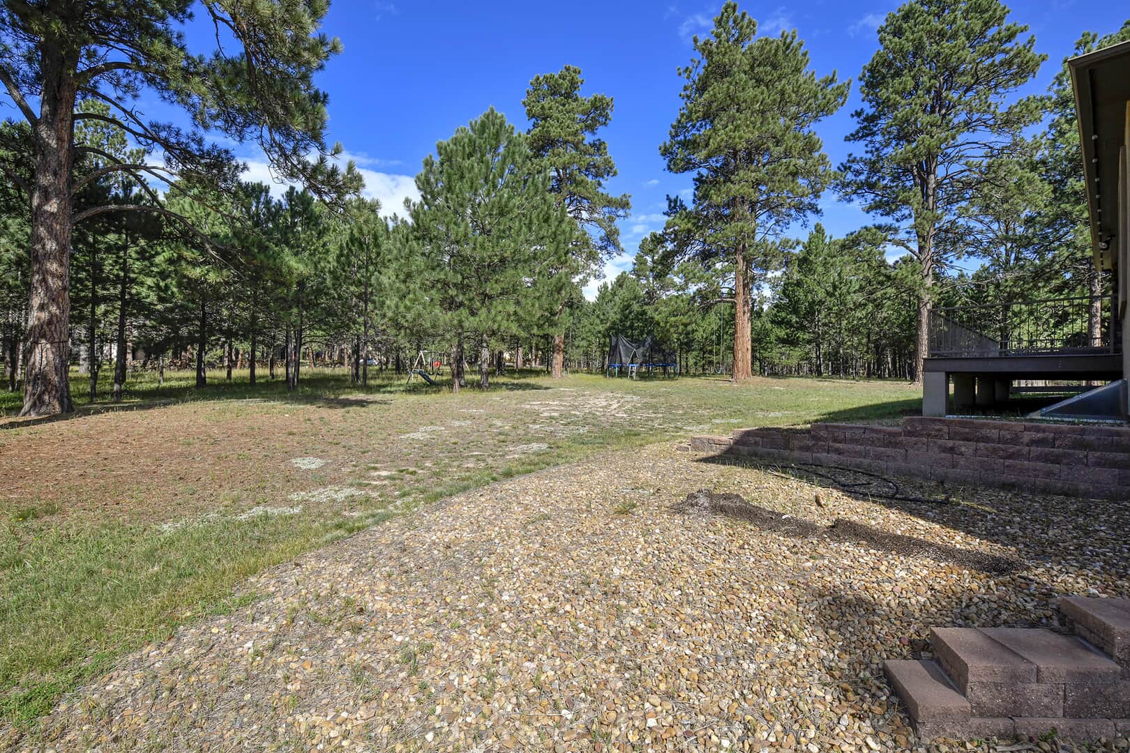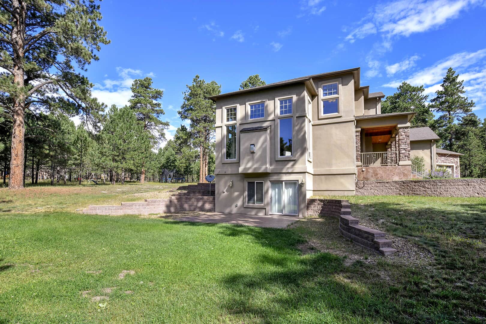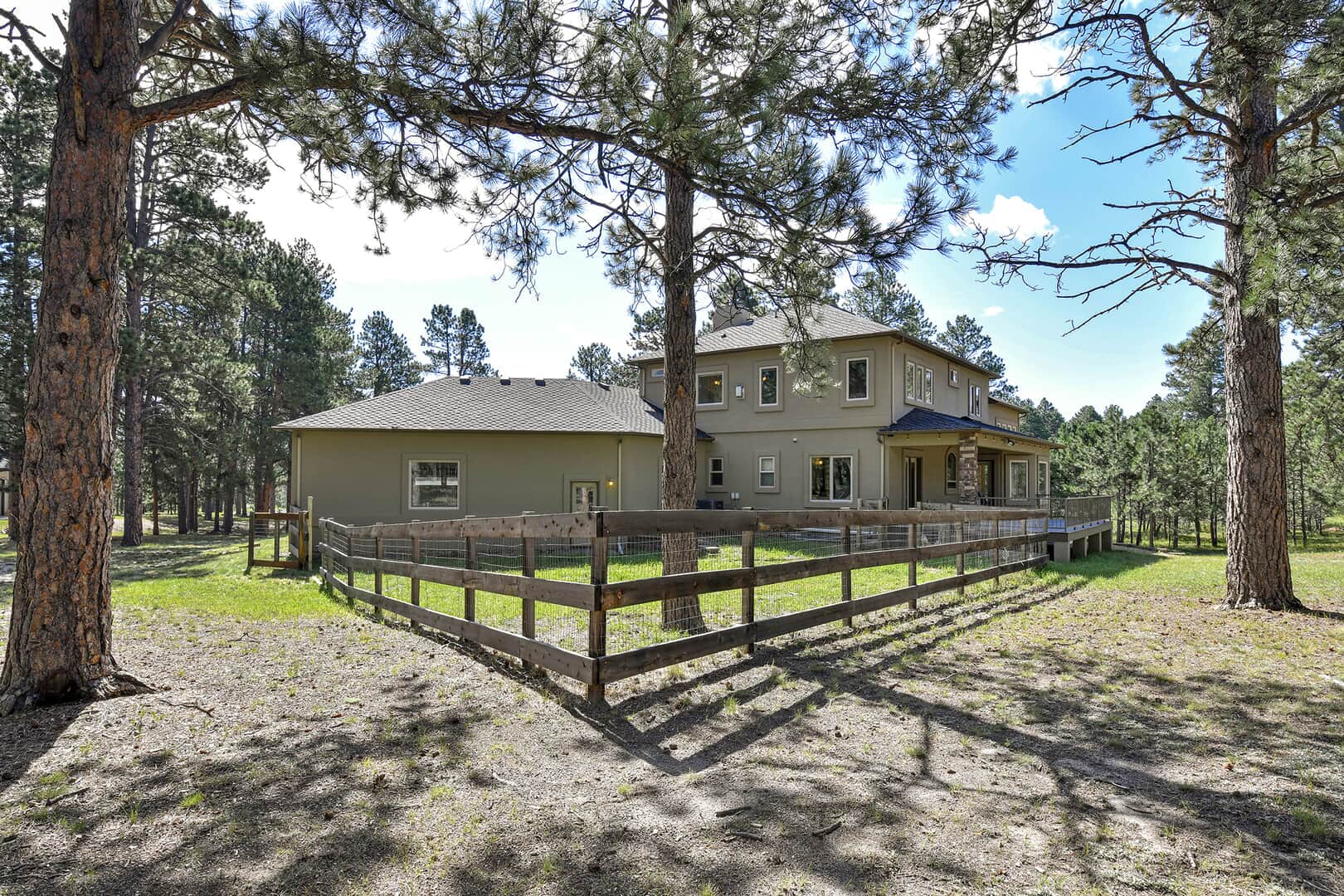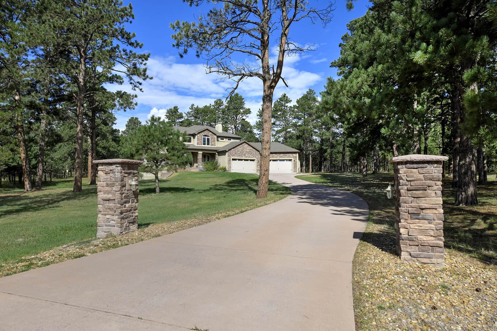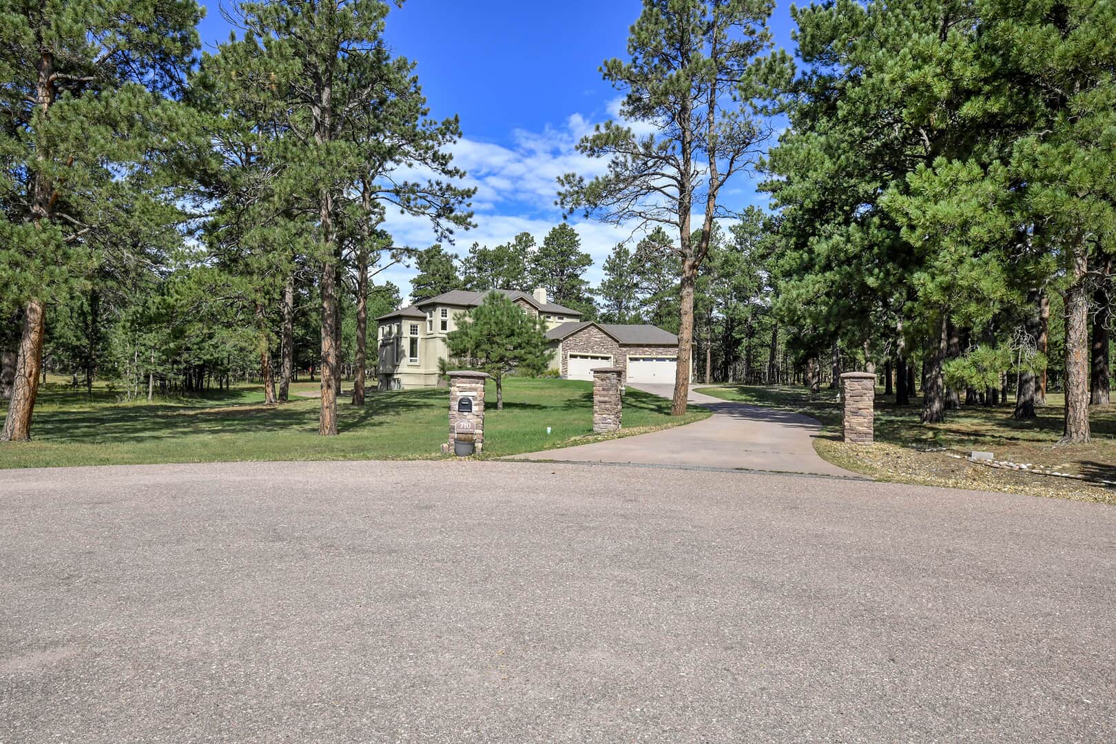 Located on a quiet cul-de-sac and nestled in the Ponderosa Pines on nearly THREE AND A HALF acres in Prestigious Kings Deer, this Stucco and Stone Two-Story Walk-out is True Colorado Luxury Living! Stamped concrete walkway leads to the covered entry with tongue & groove ceiling. Vaulted hardwood entry has art niche with marble mosaic tile and opens through arch to formal dining room w/rock wall, tray ceiling, art niche, wainscotting and kitchen access. Gourmet Kitchen has granite counters, extended height cabinetry, Stainless appliances include 6-burner gas stove w/griddle. oven & proofing oven, massive center island w/storage, vegetable sink and full secondary oven, and pass through bar with counter seating. Generous Breakfast Bay has walkout to private, covered composite deck w/wiring for speakers and access to fenced dog run. Enormous Living Room has two-story windows to let the natural wooded views in, and a stone wall with gas fireplace. Main level walk-out office off of powder room has coffered ceiling and built-in bookcases. Master Bedroom has 2-sided gas fireplace shared with 5-piece master bath with jetted tub and walk-in shower as well as 14 x 7 walk-in closet. Two more sizable bedrooms w/extended closets and a full bath w/double vanity upstairs. Enormous lower level Family Room boasts stone gas fireplace, entertainment center, game closet and wet bar, walks out to stamped concrete side patio. Spacious bedroom and full bath w/bidet and granite counters has private access to exercise room w/TV. Enormous storage room with shelving as well as under stair storage. Main level laundry/mudroom with washer, dryer, utility sink, built-in ironing board and bench with storage and closet has access to FOUR PLUS car garage with workbench, freezer, and loads of shelving! Expansive backyard with trampoline, swings and room for more in a park-like setting. Intercom, Security System, Central Air, 2 water heaters & furnaces. NEW CARPET & PAINT THROUGHOUT! A TRUE RETREAT!
