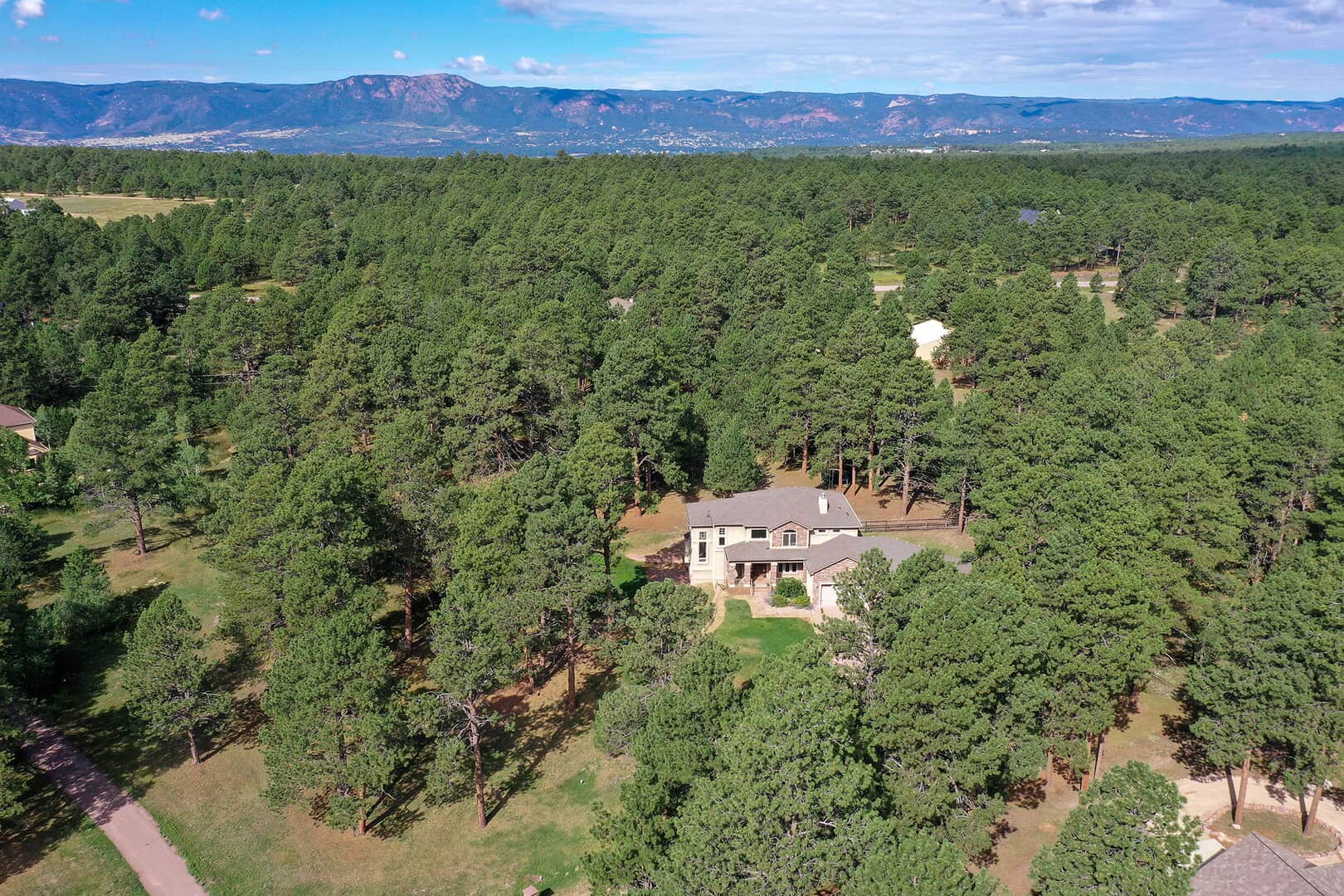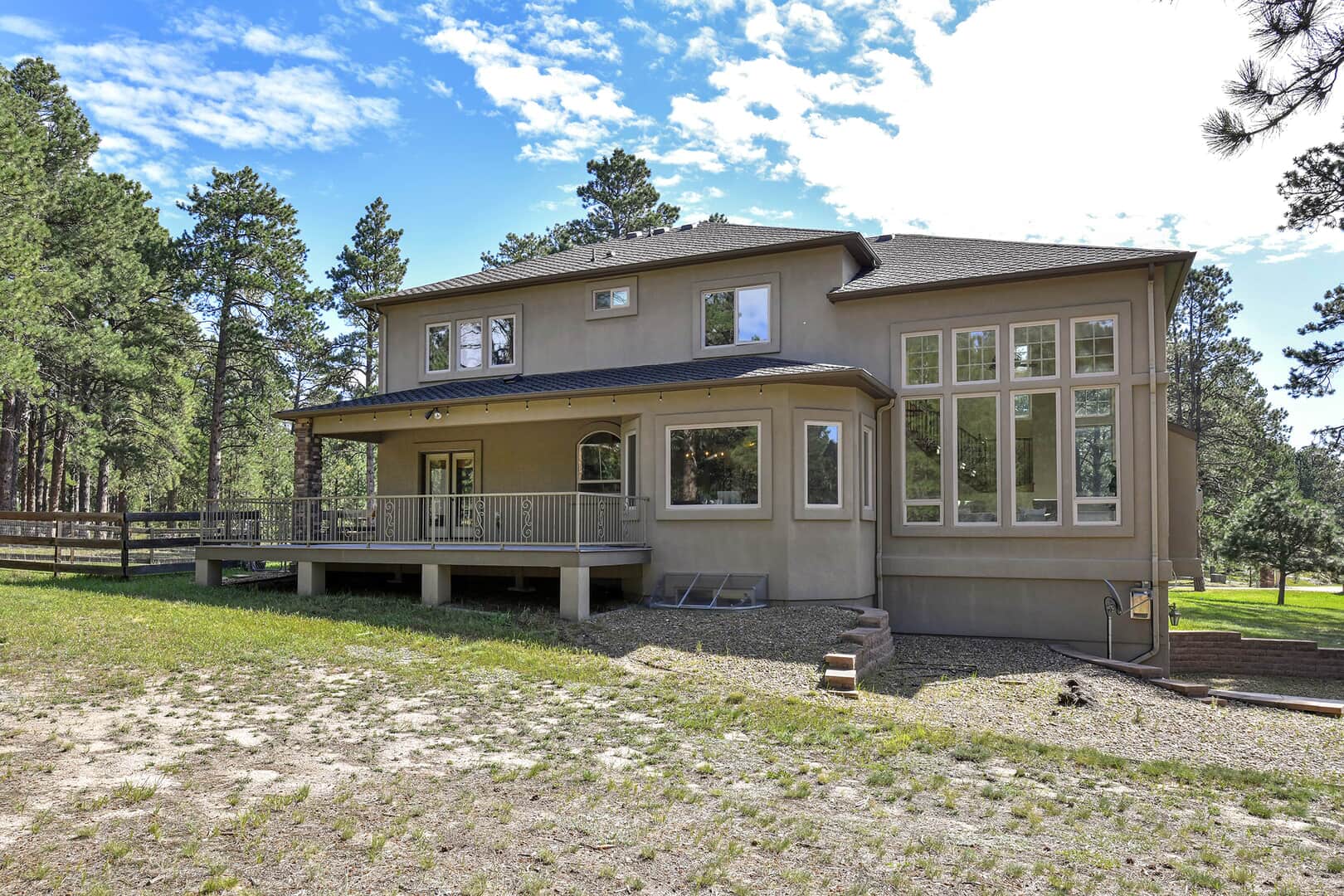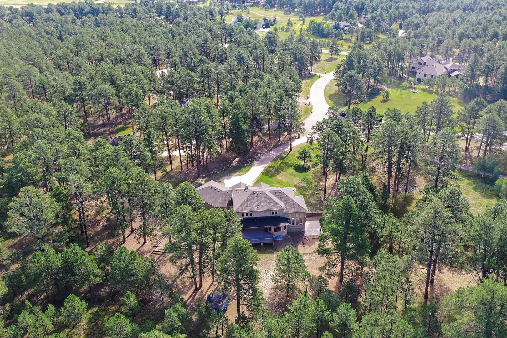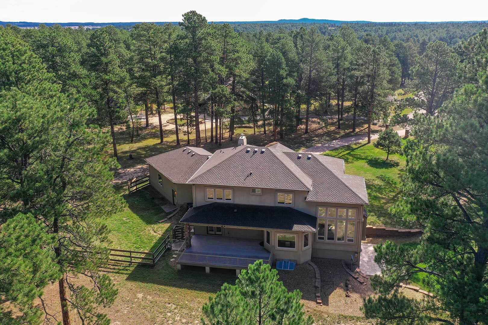 Located on a quiet cul-de-sac and nestled in the Ponderosa Pines on nearly THREE AND A HALF acres in Prestigious Kings Deer, this Stucco and Stone Two-Story Walk-out is True Colorado Luxury Living! Stamped concrete walkway leads to the covered entry with tongue & groove ceiling. Vaulted hardwood entry has art niche with marble mosaic tile and opens through arch to formal dining room w/rock wall, tray ceiling, art niche, wainscotting and kitchen access. Gourmet Kitchen has granite counters, extended height cabinetry, Stainless appliances include 6-burner gas stove w/griddle. oven & proofing oven, massive center island w/storage, vegetable sink and full secondary oven, and pass through bar with counter seating. Generous Breakfast Bay has walkout to private, covered composite deck w/wiring for speakers and access to fenced dog run. Enormous Living Room has two-story windows to let the natural wooded views in, and a stone wall with gas fireplace. Main level walk-out office off of powder room has coffered ceiling and built-in bookcases. Master Bedroom has 2-sided gas fireplace shared with 5-piece master bath with jetted tub and walk-in shower as well as 14 x 7 walk-in closet. Two more sizable bedrooms w/extended closets and a full bath w/double vanity upstairs. Enormous lower level Family Room boasts stone gas fireplace, entertainment center, game closet and wet bar, walks out to stamped concrete side patio. Spacious bedroom and full bath w/bidet and granite counters has private access to exercise room w/TV. Enormous storage room with shelving as well as under stair storage. Main level laundry/mudroom with washer, dryer, utility sink, built-in ironing board and bench with storage and closet has access to FOUR PLUS car garage with workbench, freezer, and loads of shelving! Expansive backyard with trampoline, swings and room for more in a park-like setting. Intercom, Security System, Central Air, 2 water heaters & furnaces. NEW CARPET & PAINT THROUGHOUT! A TRUE RETREAT!
